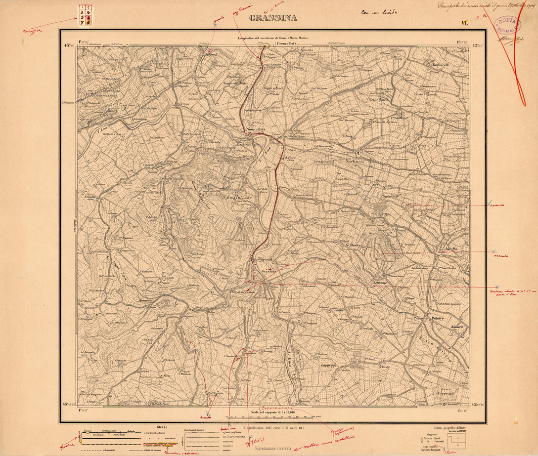 "I rilievi, in parte grafici e in parte numerici, sono stati eseguiti per ordine del Comando della Divisione Militare di Firenze negli anni dal 1896 al 1900 e, per i primi 6 fogli, aggiornati nel 1923, dalla riduzione di tali rilievi sono state realizzate le Tavolette del Foglio 106 II SO e II NO della carta d' Italia."