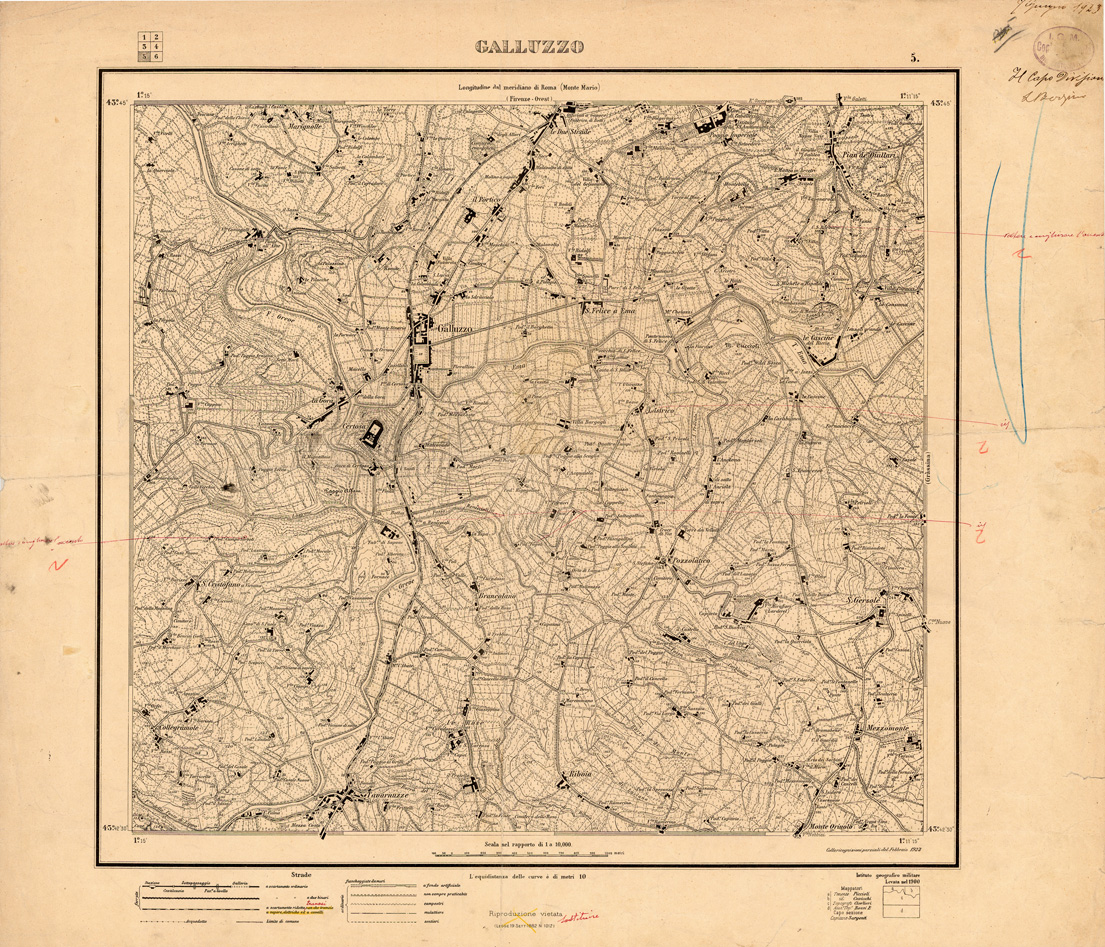 "I rilievi, in parte grafici e in parte numerici, sono stati eseguiti per ordine del Comando della Divisione Militare di Firenze negli anni dal 1896 al 1900 e, per i primi 6 fogli, aggiornati nel 1923, dalla riduzione di tali rilievi sono state realizzate le Tavolette del Foglio 106 II SO e II NO della carta d' Italia."