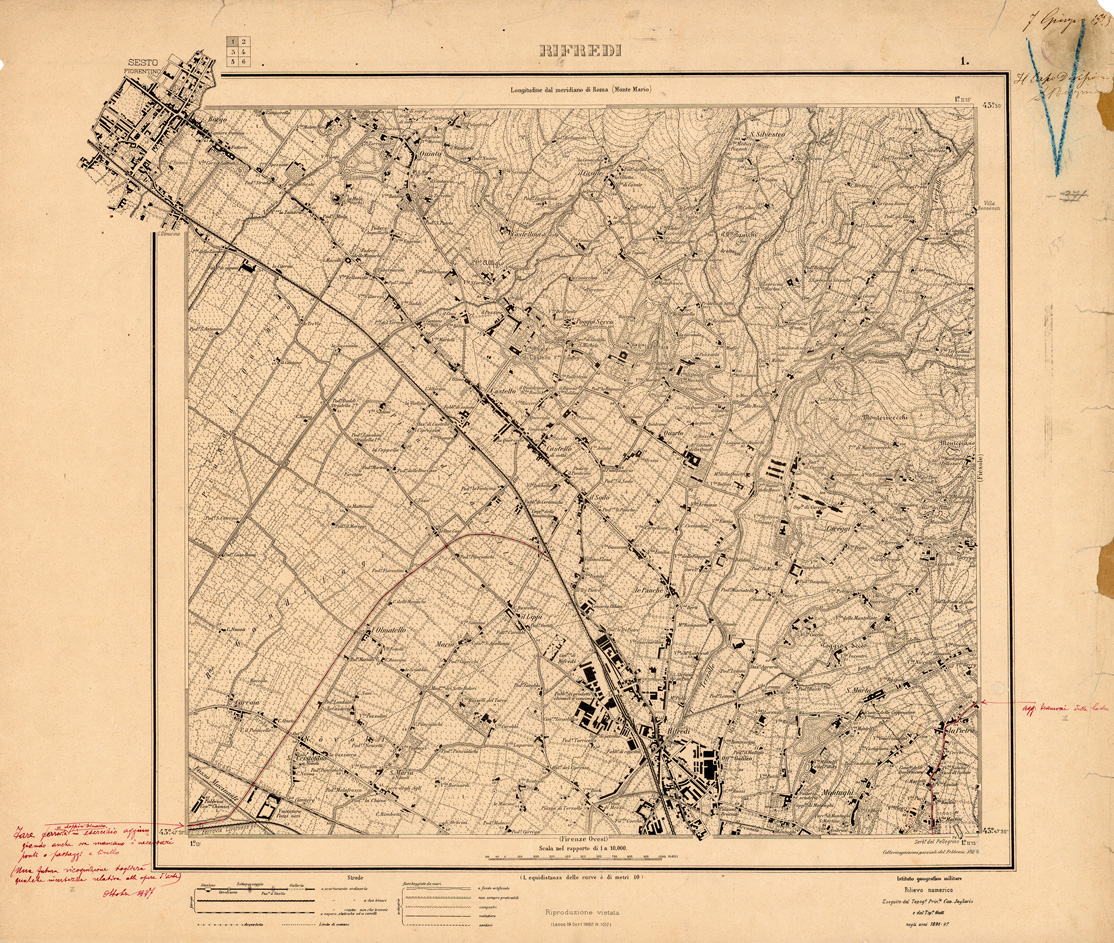 "I rilievi, in parte grafici e in parte numerici, sono stati eseguiti per ordine del Comando della Divisione Militare di Firenze negli anni dal 1896 al 1900 e, per i primi 6 fogli, aggiornati nel 1923, dalla riduzione di tali rilievi sono state realizzate le Tavolette del Foglio 106 II SO e II NO della carta d' Italia."