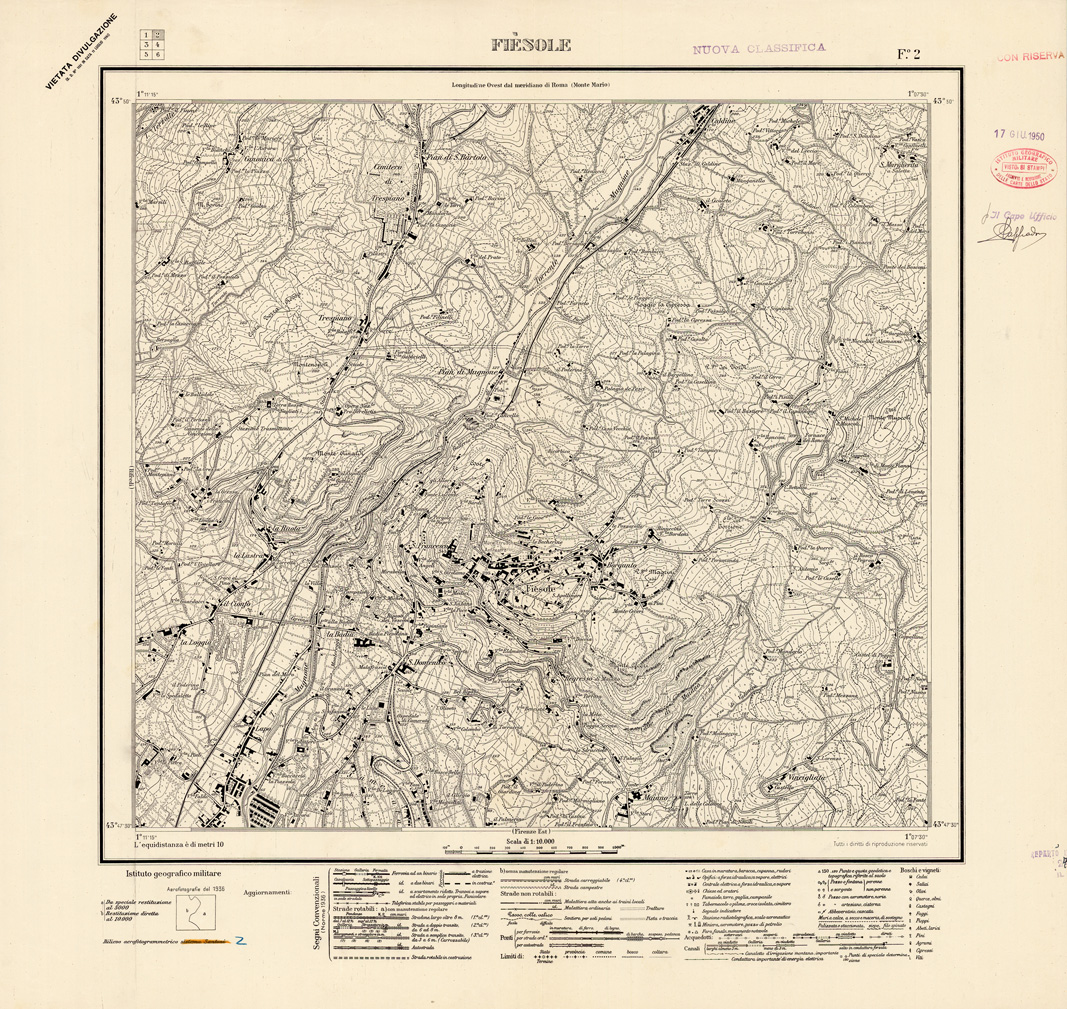 "Carta realizzata dalla Sezione Fotogrammetrica della Divisione Topografica dell' IGM, ottenuta in parte dalla riduzione degli originali di restituzione eseguiti per la Carta di Firenze alla scala di 1:5.000 ed in parte da fotogrammi eseguiti appositamente per completare il rilievo di tutto il territorio compreso nelle 4 sezioni della tavoletta di Firenze alla scala di 1:25.000 sostituisce i primi 4 fogli del rilievo a uguale scala del 1896 - 1897 ( categorico 9364 ) dalla riduzione di queste 4 sezioni è stata ridisegnata la corrispondente tavoletta 106 II NO della Carta d' Italia."