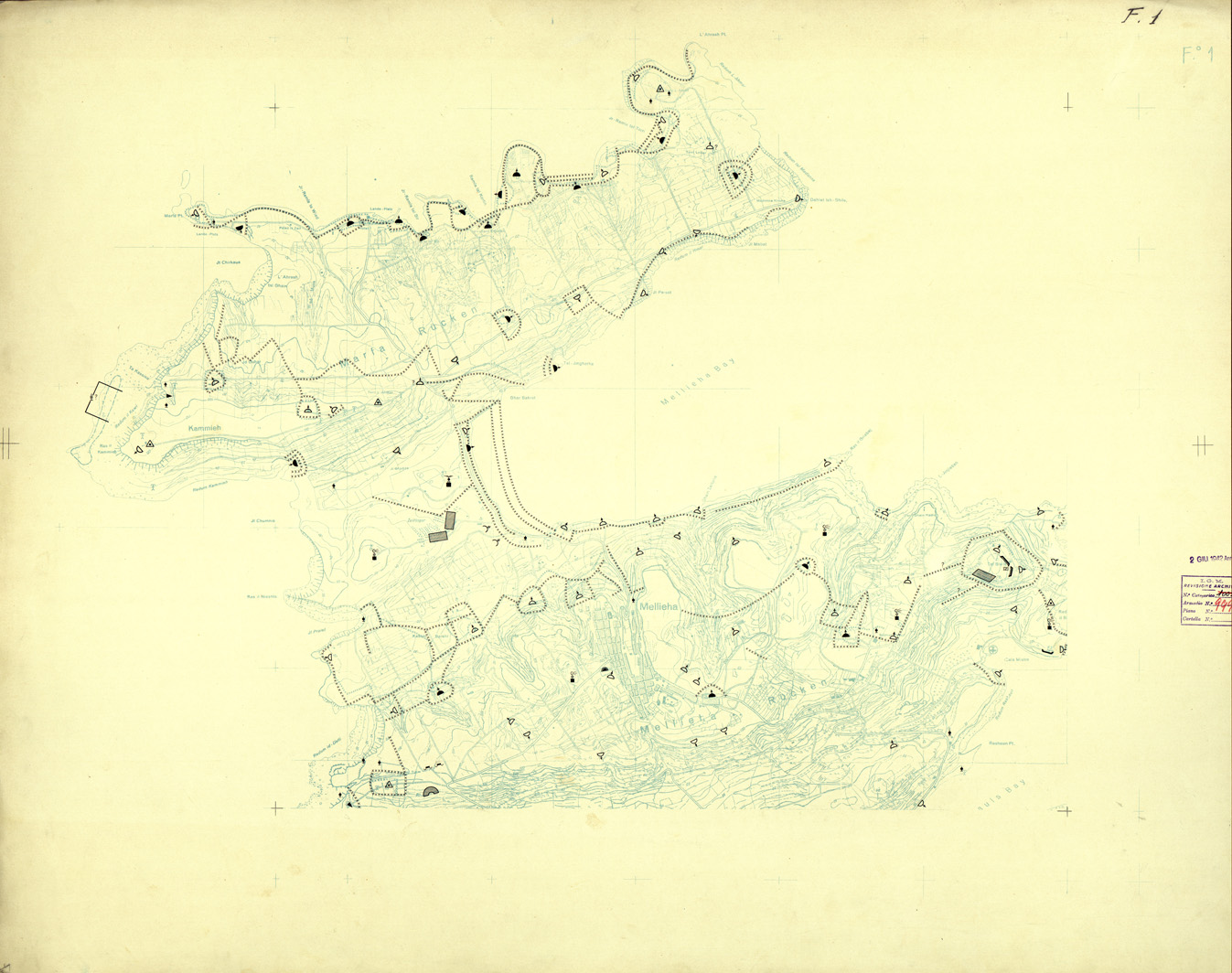 "Compilata dalla carta Tedesca dell' Isola di Malta alla scala di 1:10.000 del 1941. Originali a colori separati più copia di prova a colori riuniti con note di revisione."