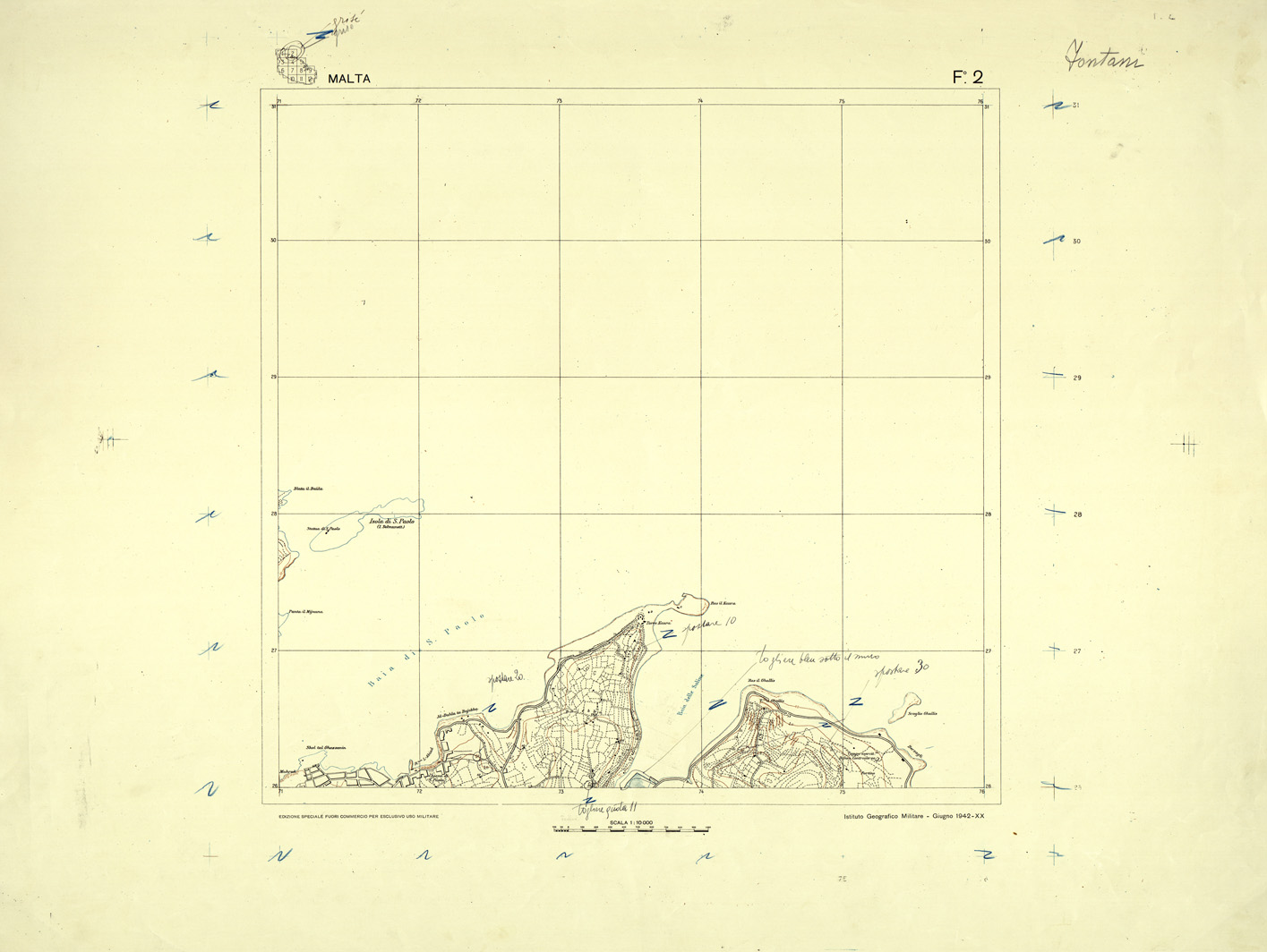 "Compilata dalla carta Tedesca dell' Isola di Malta alla scala di 1:10.000 del 1941. Originali a colori separati più copia di prova a colori riuniti con note di revisione."