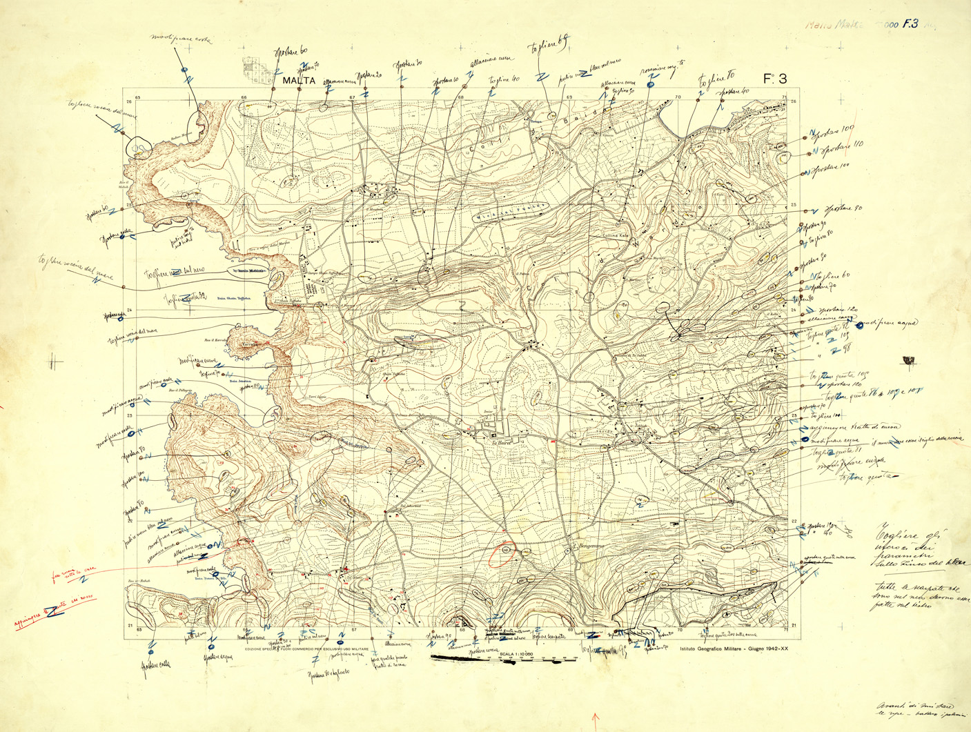 "Compilata dalla carta Tedesca dell' Isola di Malta alla scala di 1:10.000 del 1941. Originali a colori separati più copia di prova a colori riuniti con note di revisione."