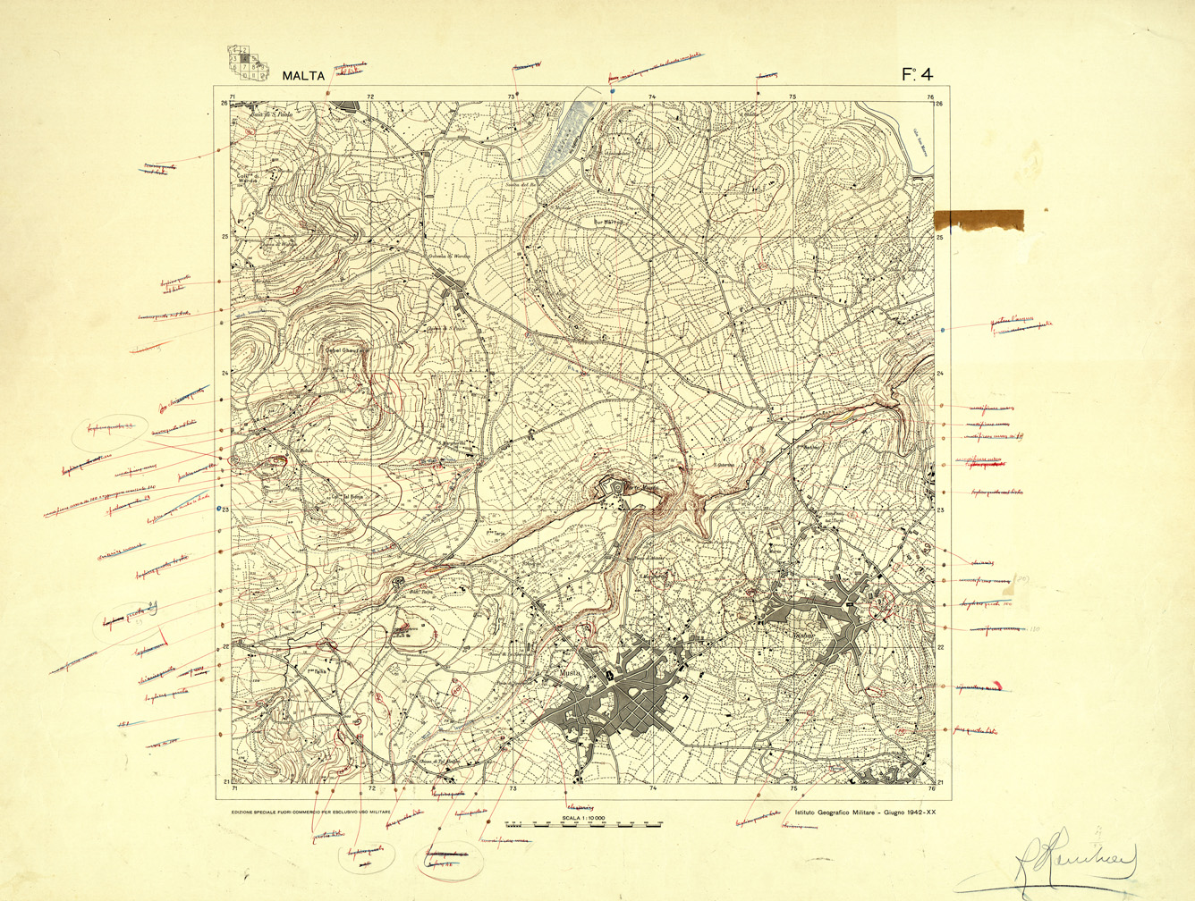 "Compilata dalla carta Tedesca dell' Isola di Malta alla scala di 1:10.000 del 1941. Originali a colori separati più copia di prova a colori riuniti con note di revisione."