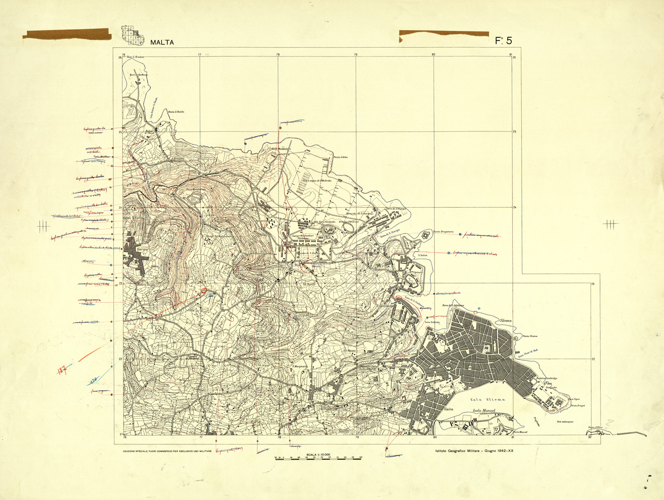 "Compilata dalla carta Tedesca dell' Isola di Malta alla scala di 1:10.000 del 1941. Originali a colori separati più copia di prova a colori riuniti con note di revisione."