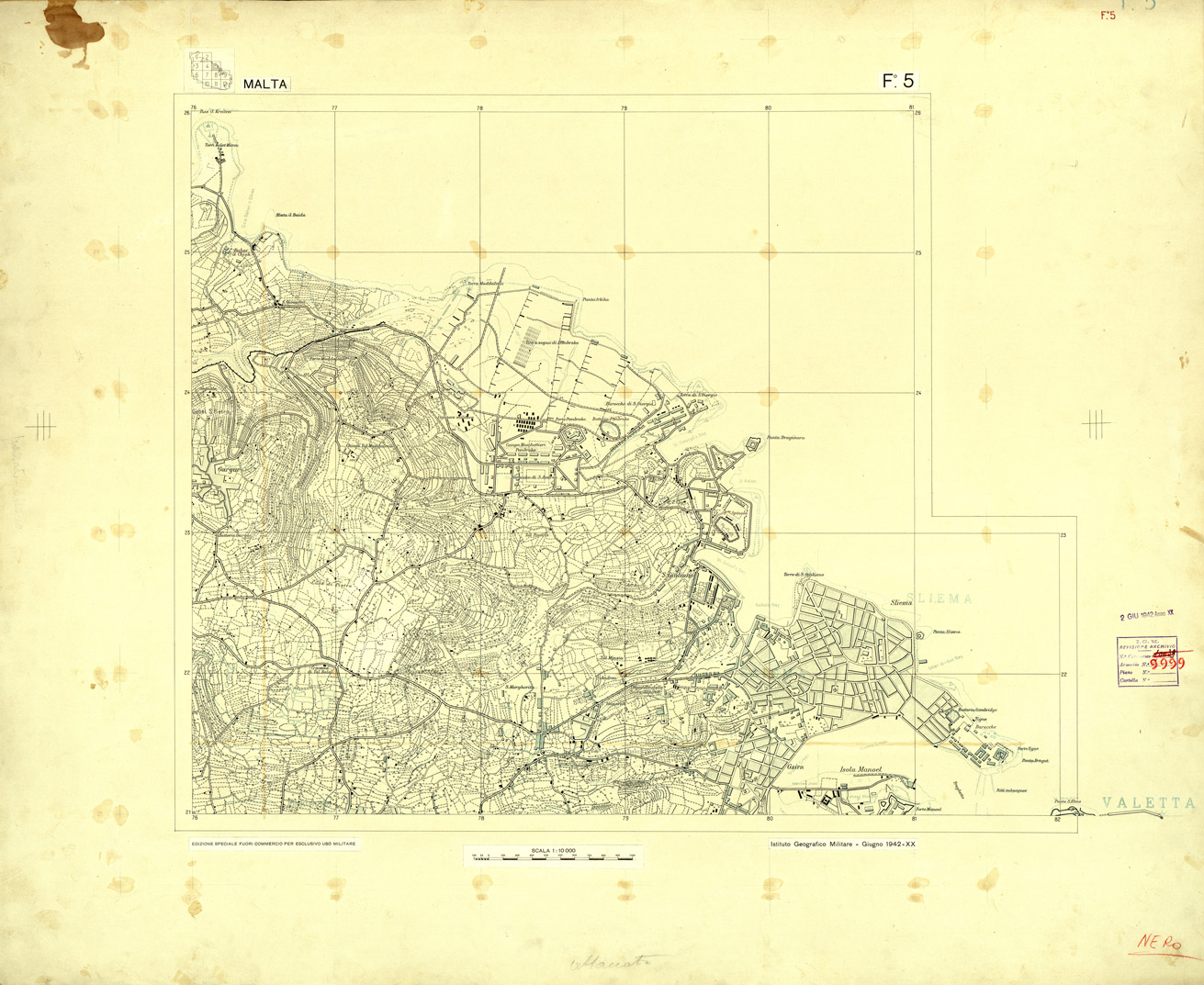 "Compilata dalla carta Tedesca dell' Isola di Malta alla scala di 1:10.000 del 1941. Originali a colori separati più copia di prova a colori riuniti con note di revisione."