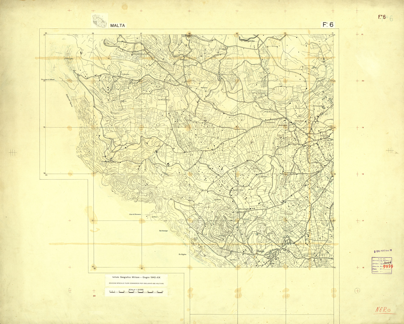 "Compilata dalla carta Tedesca dell' Isola di Malta alla scala di 1:10.000 del 1941. Originali a colori separati più copia di prova a colori riuniti con note di revisione."