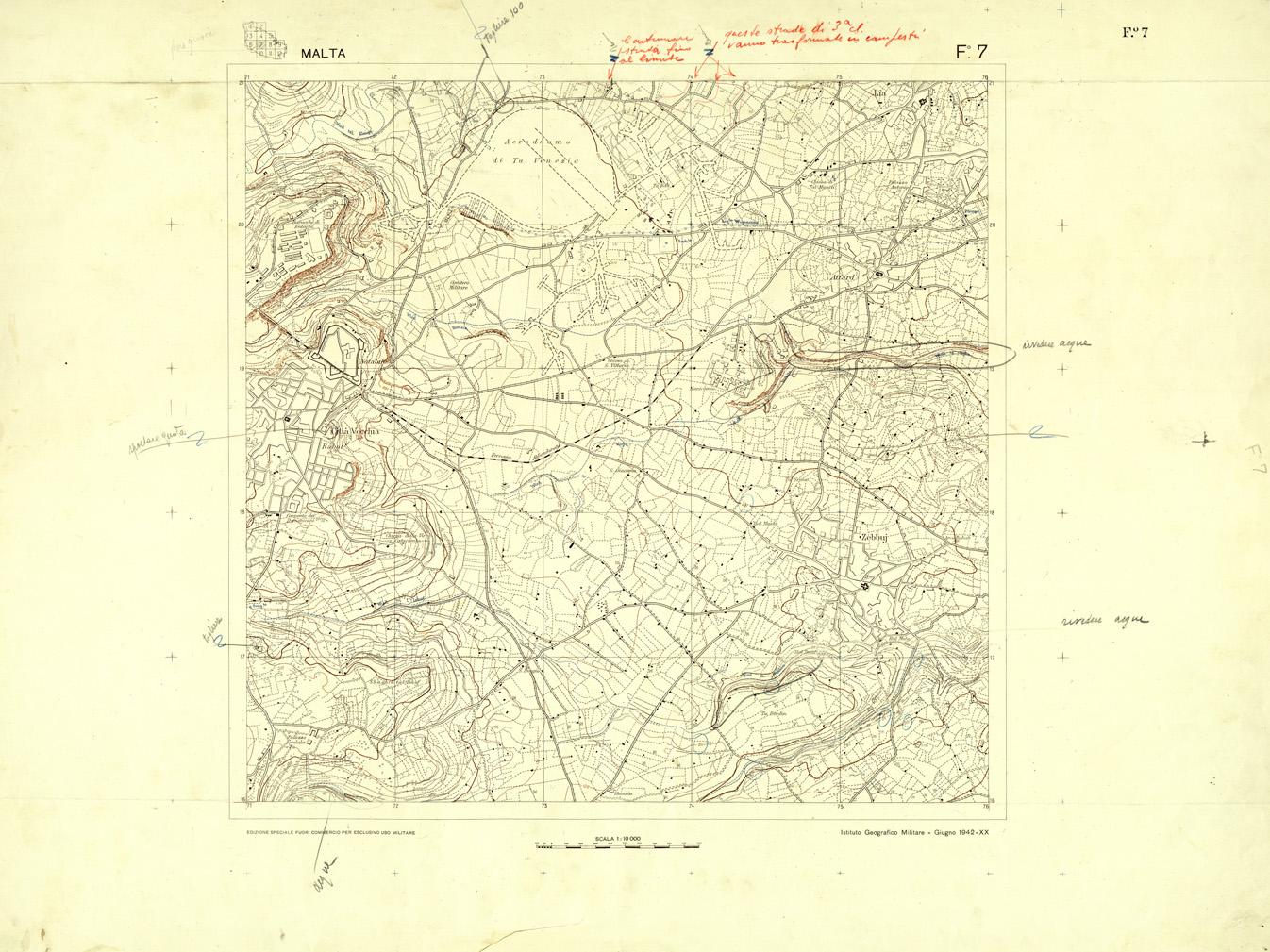 "Compilata dalla carta Tedesca dell' Isola di Malta alla scala di 1:10.000 del 1941. Originali a colori separati più copia di prova a colori riuniti con note di revisione."