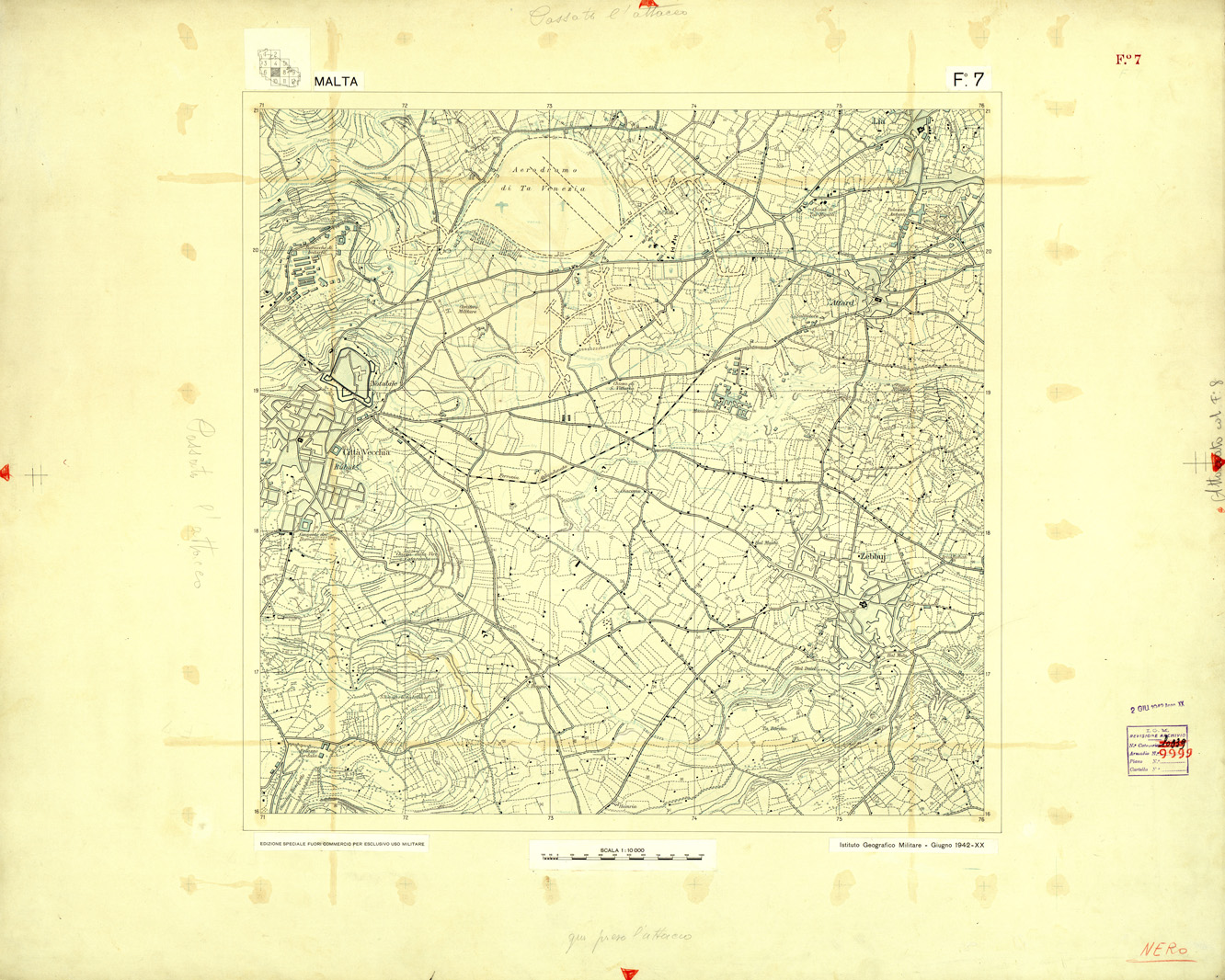 "Compilata dalla carta Tedesca dell' Isola di Malta alla scala di 1:10.000 del 1941. Originali a colori separati più copia di prova a colori riuniti con note di revisione."