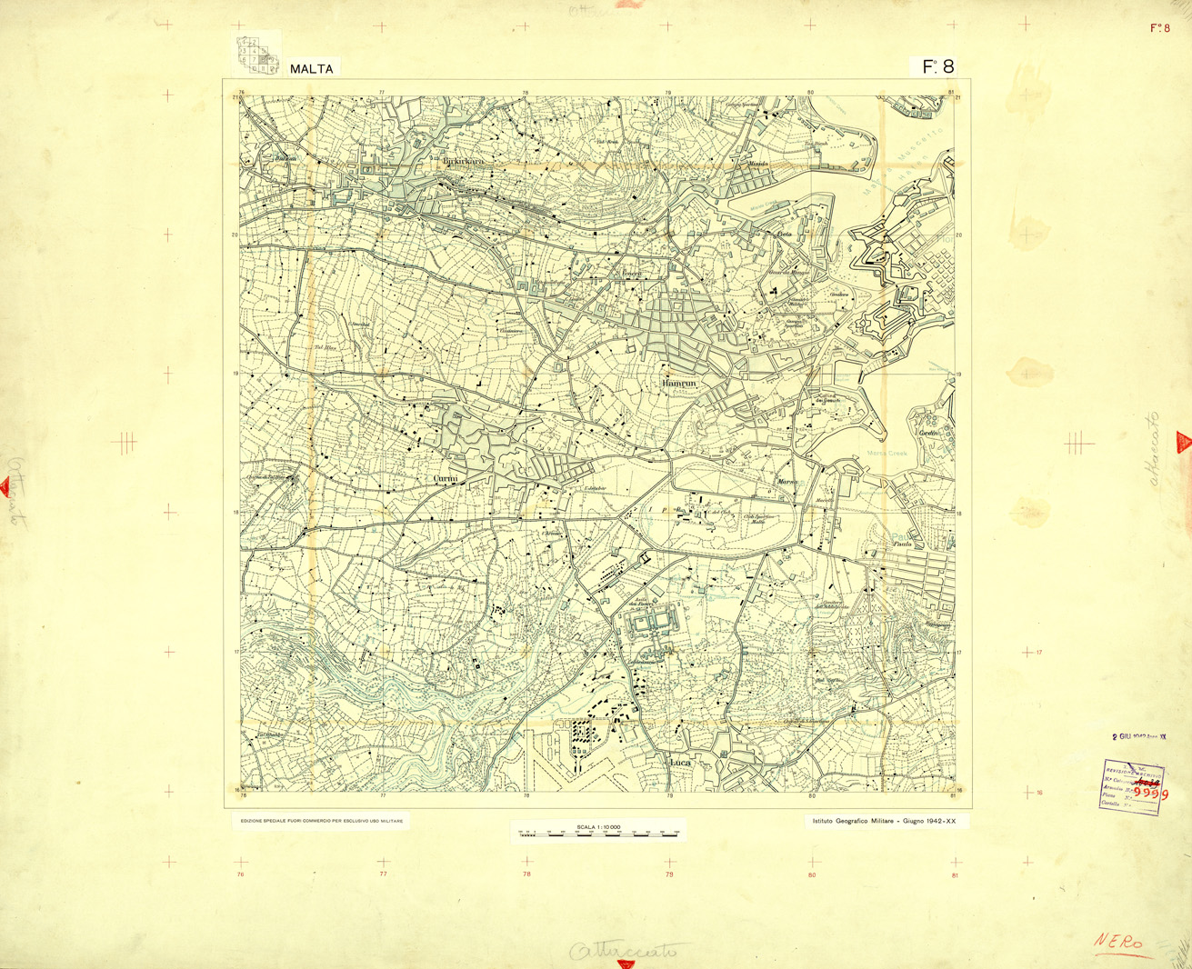 "Compilata dalla carta Tedesca dell' Isola di Malta alla scala di 1:10.000 del 1941. Originali a colori separati più copia di prova a colori riuniti con note di revisione."