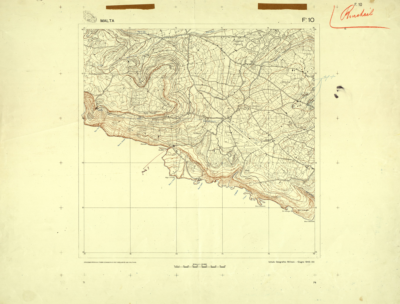 "Compilata dalla carta Tedesca dell' Isola di Malta alla scala di 1:10.000 del 1941. Originali a colori separati più copia di prova a colori riuniti con note di revisione."