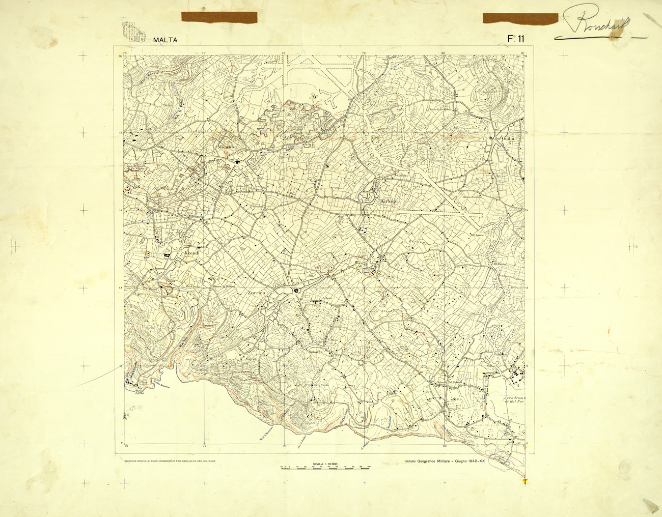 "Compilata dalla carta Tedesca dell' Isola di Malta alla scala di 1:10.000 del 1941. Originali a colori separati più copia di prova a colori riuniti con note di revisione."
