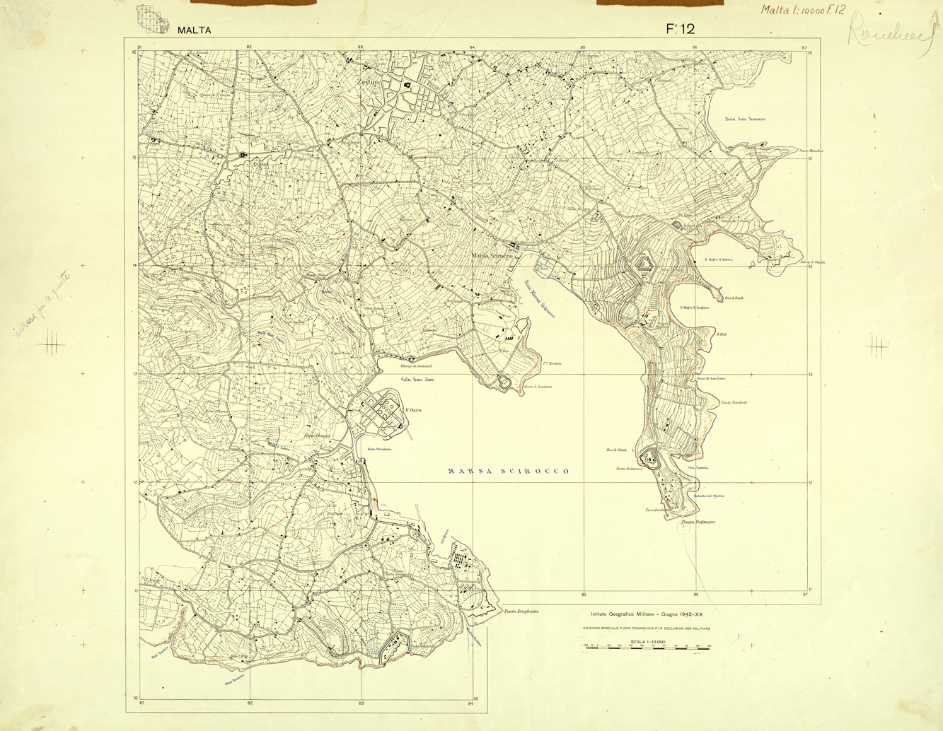 "Compilata dalla carta Tedesca dell' Isola di Malta alla scala di 1:10.000 del 1941. Originali a colori separati più copia di prova a colori riuniti con note di revisione."
