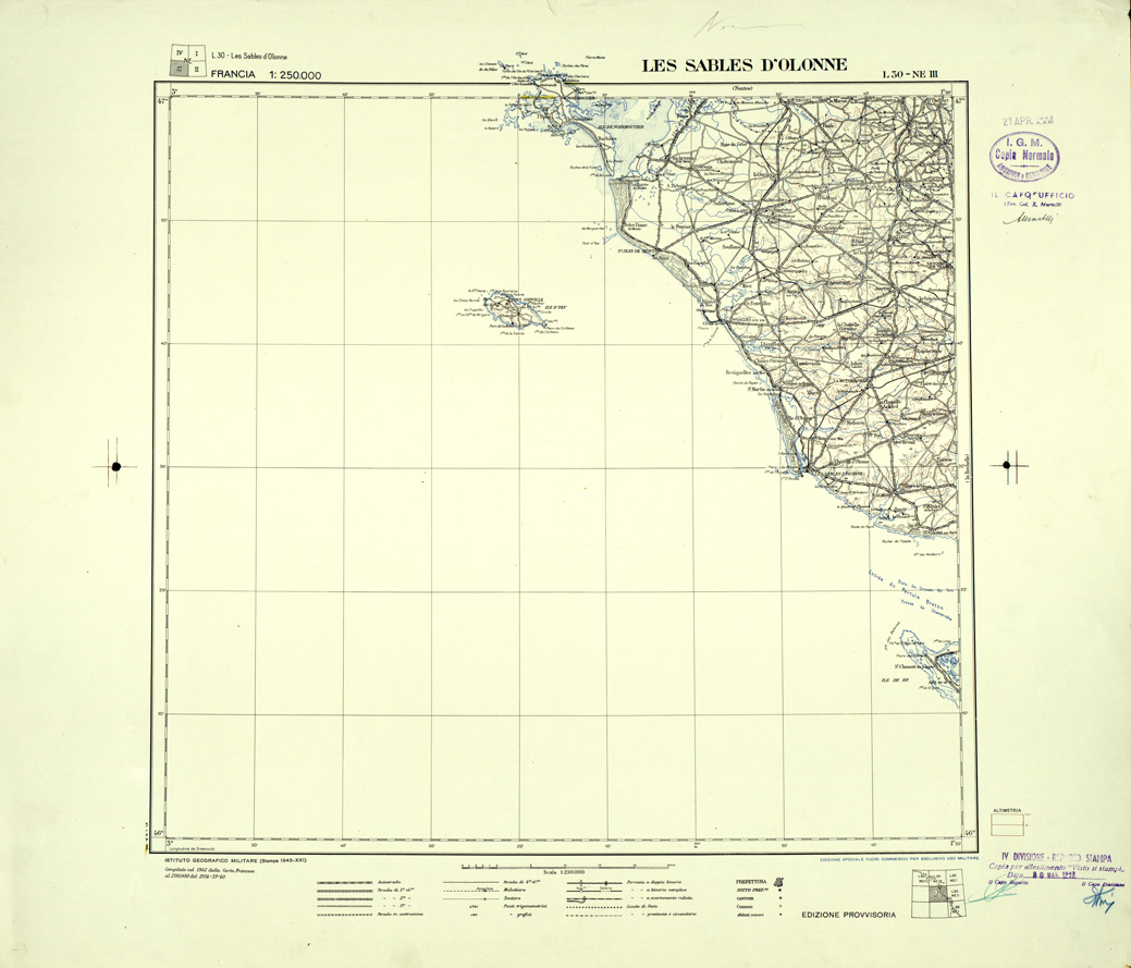 "Carta compilata nel 1942 - 1943 dalla divisione cartografica dell' IGM, fonte di compilazione la carta Francese al 200.000"