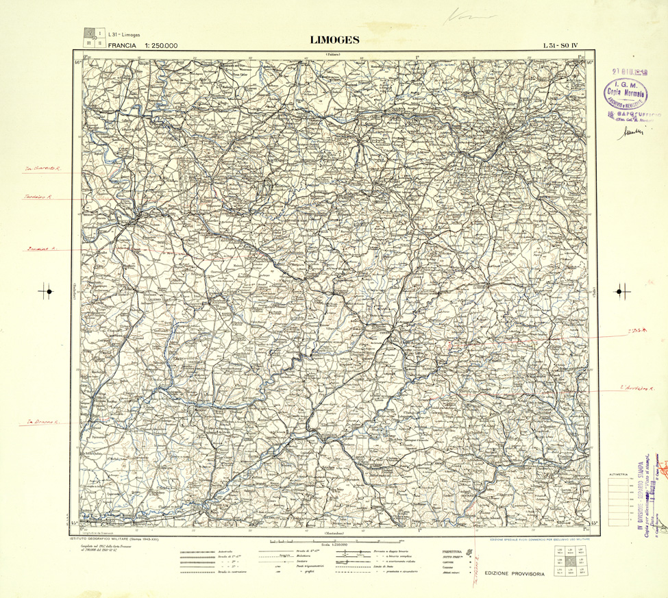 "Carta compilata nel 1942 - 1943 dalla divisione cartografica dell' IGM, fonte di compilazione la carta Francese al 200.000"
