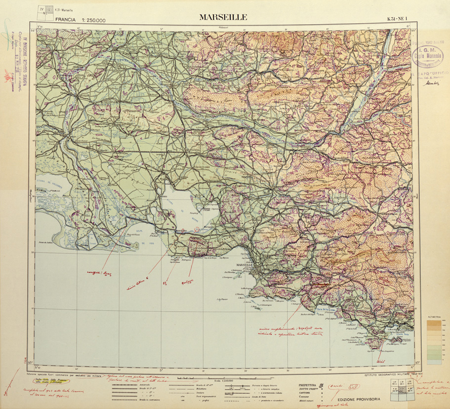 "Carta compilata nel 1942 - 1943 dalla divisione cartografica dell' IGM, fonte di compilazione la carta Francese al 200.000"