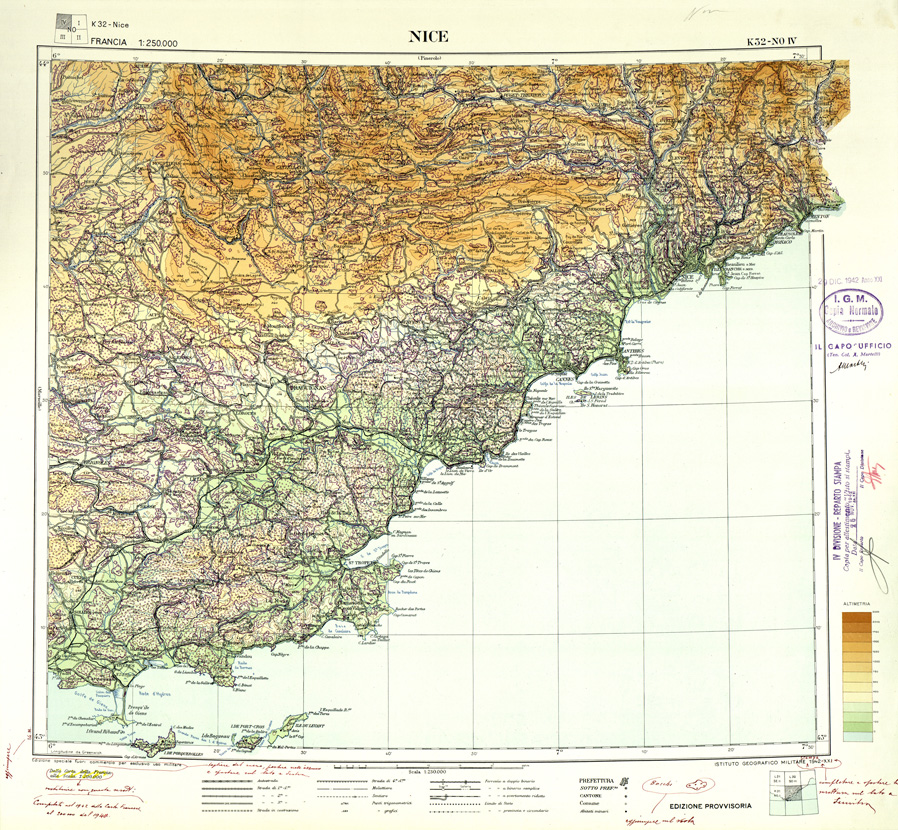 "Carta compilata nel 1942 - 1943 dalla divisione cartografica dell' IGM, fonte di compilazione la carta Francese al 200.000"