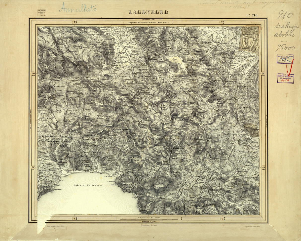 "Originali sostituiti,in grande formato edizione a tratteggio. Carta monocolore disegnata a penna su carta da disegno montata su cartone. Proiezione naturale, equidistanza delle curve:f°54 mt 100 f°71 mt 50 f°210 mt 50. Rilievo del 1880/1886."