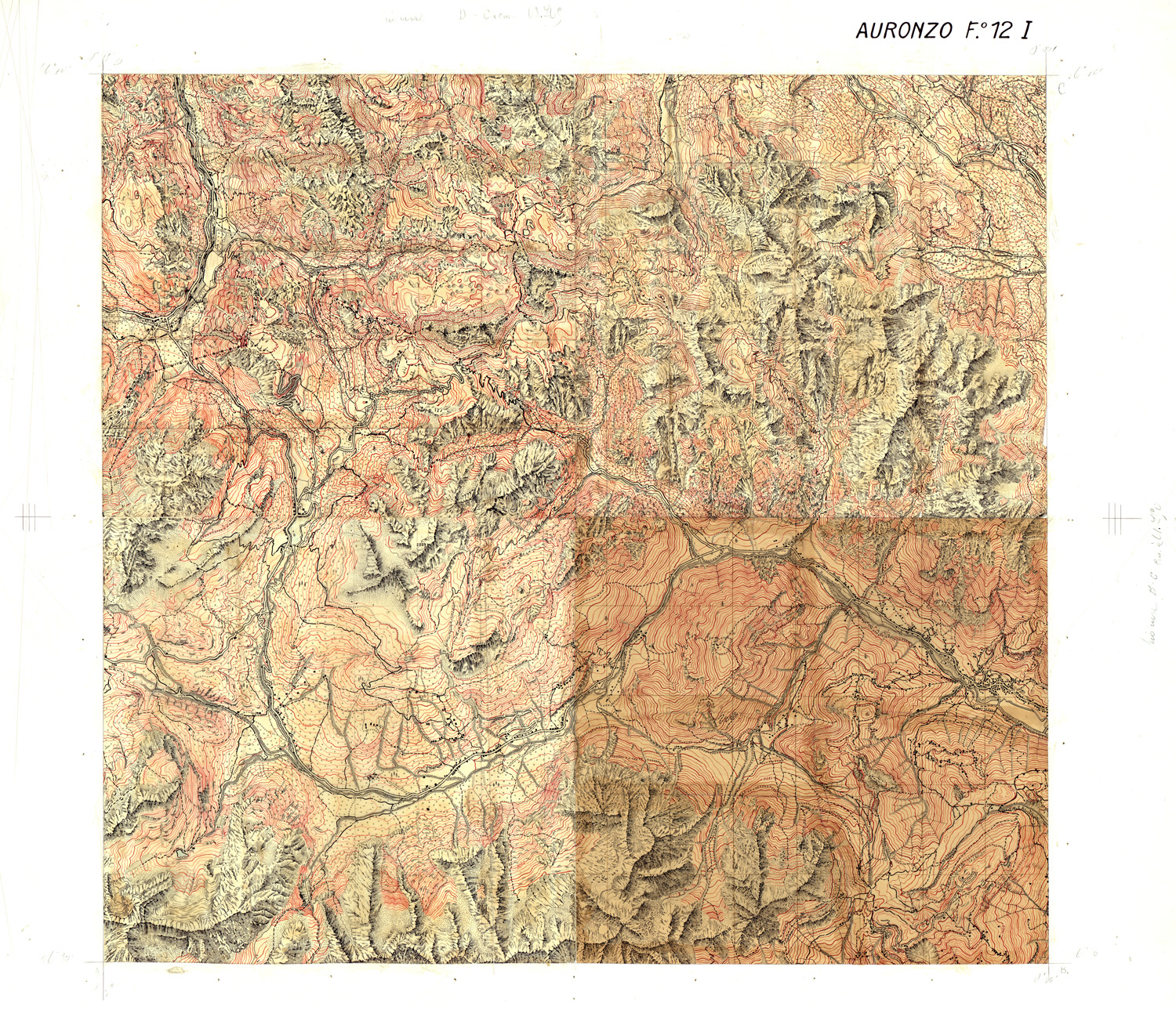 "Italia in cromo. Spogli dei fogli n° 12 I II III IV e n° 13 I II III IV. Disegnati a penna su carta lucida, montata su cartoncino americano. Presumiamo che detti spogli siano stati realizzati per compilare i relativi quadranti in cromo, ad eventi bellici conclusi, non furono disegnati. Equidistanza delle curve m. 25."