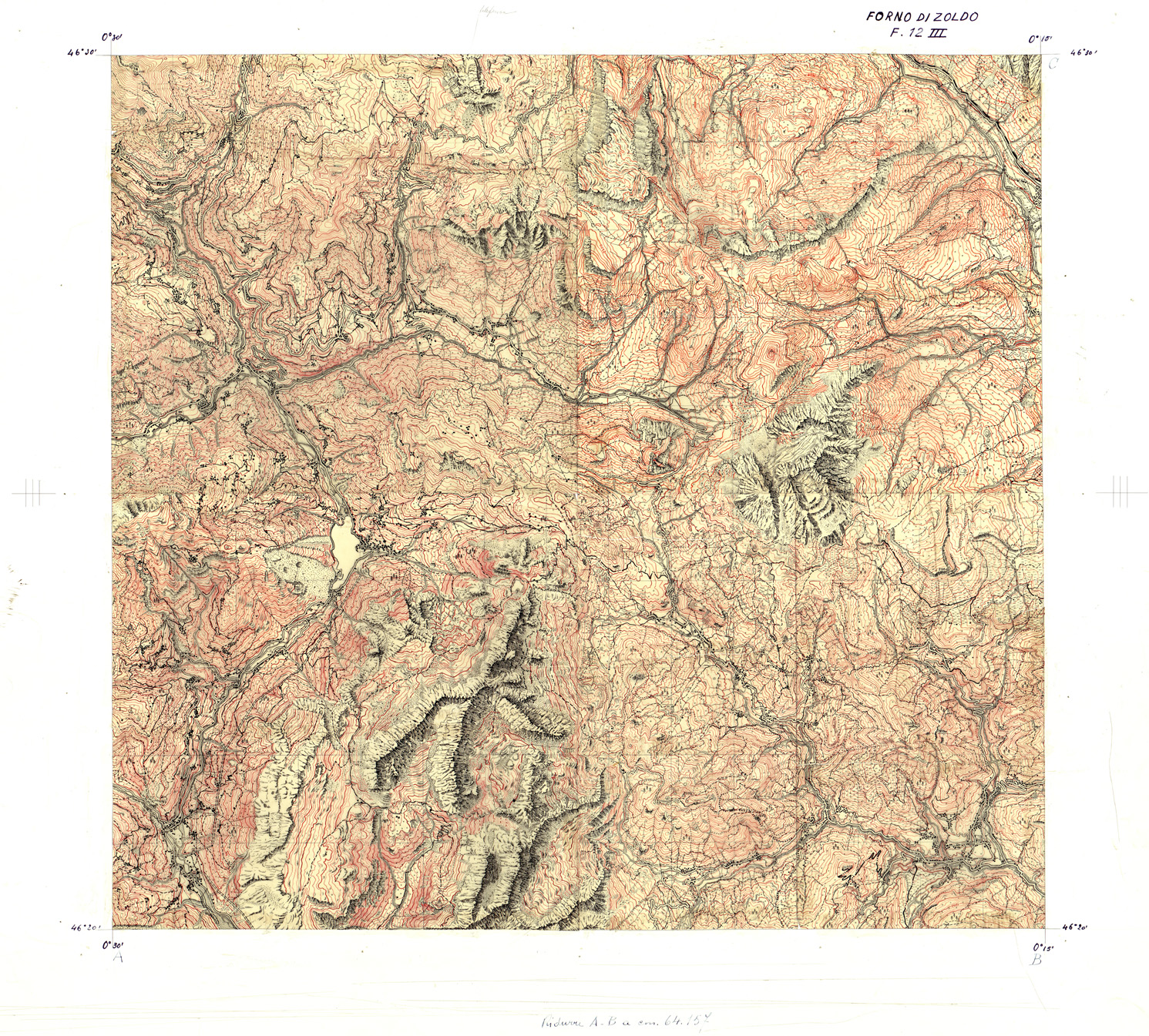 "Italia in cromo. Spogli dei fogli n° 12 I II III IV e n° 13 I II III IV. Disegnati a penna su carta lucida, montata su cartoncino americano. Presumiamo che detti spogli siano stati realizzati per compilare i relativi quadranti in cromo, ad eventi bellici conclusi, non furono disegnati. Equidistanza delle curve m. 25."