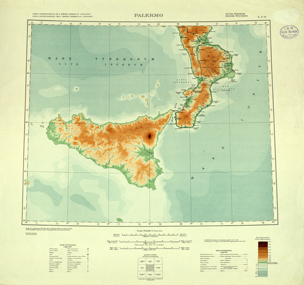 "Al congresso Geografico Internazionale di Cambridge e precisamente nella seduta del 18 luglio 1928, fu proposta dal rappresentante dell'Italia, la realizzazione di una Carta Internazionale dell'Impero Romano. Tale progetto fu approvato nel 1929, in riunione tenutasi a Firenze. Fu stabilito che la carta avrebbe avuto le stesse caratteristiche di quella Internazionale al Milionesimo, solita numerazione e reticolato per coprire la superficie dell'Impero Romano al tempo della sua massima estensione. La compilazione della carta fu affidata a diversi stati, l'Italia ebbe il compito di eseguire i f° : L 32 Milano L 33 Trieste K 32 Firenze K 33 Roma J 33 Palermo. Gli originali sono disegnati in nero, alla scala di 1:750.000, per la riduzione ad 1:1.000.000. Tale carta fu pubblicata a colori con tinte ipsometriche, come per la Carta Internazionale al Milionesimo, mentre per la toponomastica si avvalsero della lingua Latina. Il f° di Roma fu iniziato nel 1930 e pubblicato nel 1931 quello di Firenze nel 1934 e Palermo nel 1935. Per ulteriori notizie rimandiamo alla consultazione della rivista "L'Universo" anno 1931, fascicolo 12."