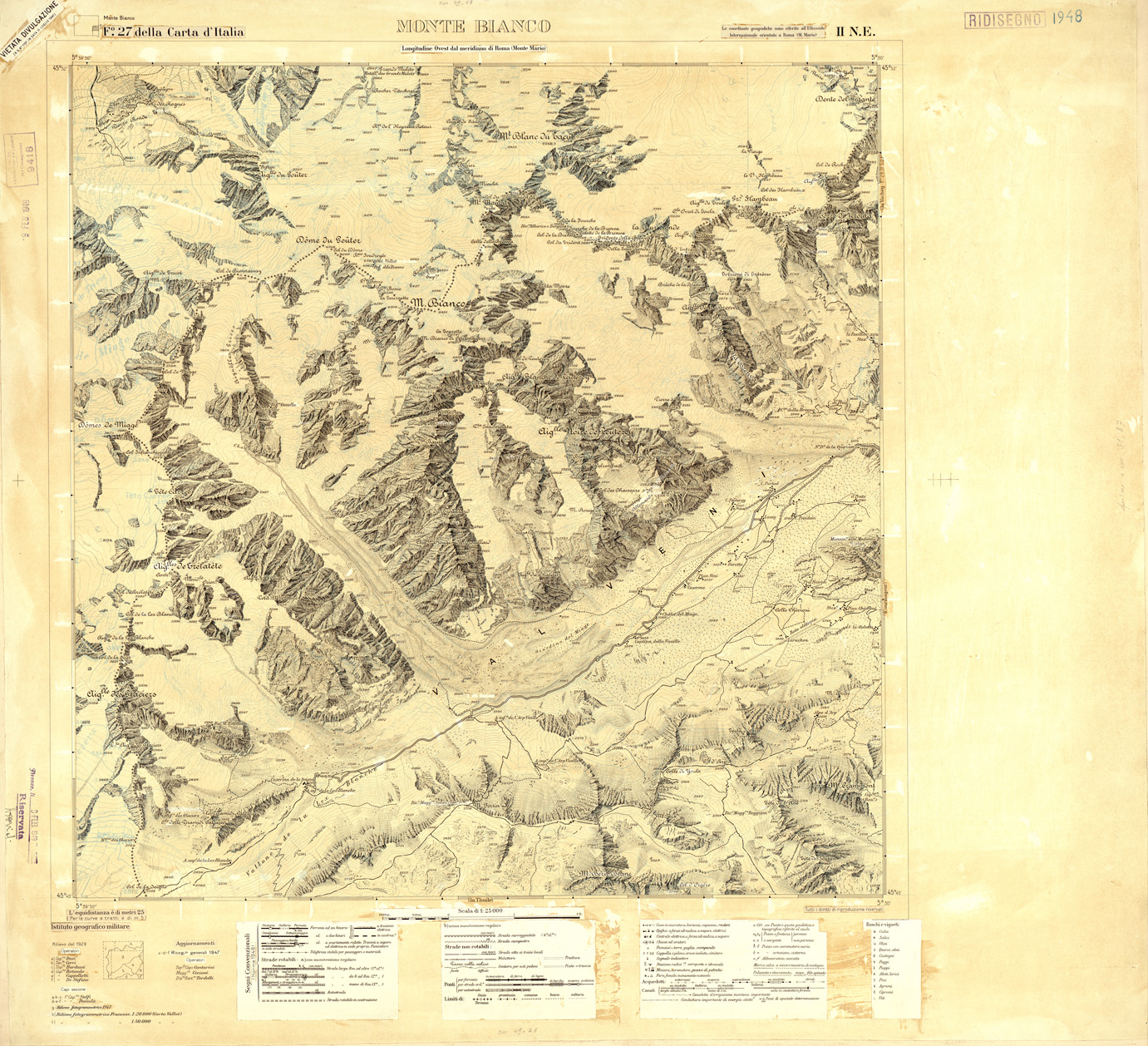 "Nel 1947 la direzione I.G.M. decise il rifacimento della parte artistica d'alta montagna delle tavolette del Monte Bianco e la Vachey rilevate nel 1929. La missione fu composta dal topografo capo Filippo Cantarini, dal ten. col. Cecioni e dal disegnatore restitutista Tordelli. Furono eseguite ex novo 12 stazioni fotogrammetriche terrestri per la ripresa fotografica della catena del m. Bianco, dal colle della Seigne al colle du Grand Ferret e zone interne di angolo morto quali i bacini del ghiacciaio du Dame e del Triolet. Venne restituita ex novo, tramite un mod. III Santoni, la zona del versante italiano,dal gruppo del m. Bianco al colle della Seigne, fino al Grand Ferret, realizzando dapprima la morfologia dei gruppi rocciosi tramite le curve di livello, mentre successivamente, furono eseguite le due tavolette secondo il nuovo criterio del disegno a 3 colori, cioe' con il nero: disegno a tratteggio dei gruppi rocciosi, ghiaioni, planimetria, nomi e quote. con il blu': idrografia, curve di livello sui ghiacciai e loro rappresentazione artistica compresi crepacci. con tonalita' bistro: le curve di livello, scarpate e frane. Per la tav. Courmayeur fu aggiornata la planimetria e per il versante francese venne utilizzata la carta del Vallot eseguita con fotogrammetria terrestre nel 1939."