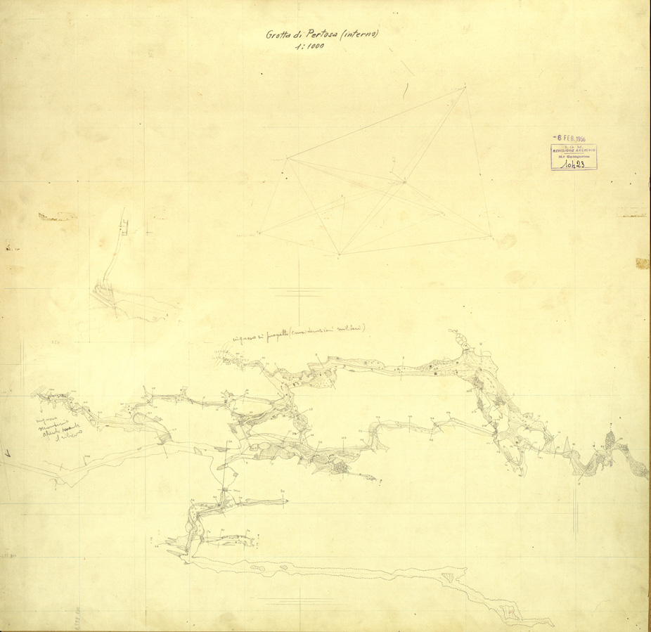"Nel 1952 l'I.G.M. esegui' il rilievo di due grotte nel Salernitano:La grotta di Pertosa, descritta minuziosamente nella rivista "Universo" n° 5 del 1954, e quella di Castelcivita o di Controne. Si sviluppano entrambe sugli opposti fianchi, all'interno del massiccio dell'Alburno,grandioso blocco dolomitico tra le valli del Tanagro e del Calore. La grotta di Pertosa e' anche denominata "grotta dell'Angelo" o di S.Michele, individuabile nel F° 199 IV SO Polla. Alla data del 1952 risulta esplorato uno sviluppo di gallerie di oltre 2.270 mt. Ulteriori notizie sulla spedizione sono contenute in un articolo della rivista "l'Universo" n° 5 del 1954."