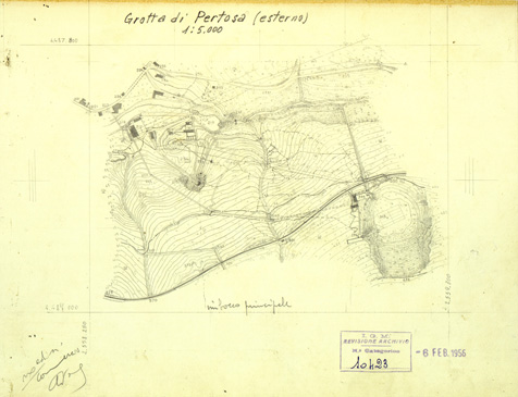 "Nel 1952 l'I.G.M. esegui' il rilievo di due grotte nel Salernitano:La grotta di Pertosa, descritta minuziosamente nella rivista "Universo" n° 5 del 1954, e quella di Castelcivita o di Controne. Si sviluppano entrambe sugli opposti fianchi, all'interno del massiccio dell'Alburno,grandioso blocco dolomitico tra le valli del Tanagro e del Calore. La grotta di Pertosa e' anche denominata "grotta dell'Angelo" o di S.Michele, individuabile nel F° 199 IV SO Polla. Alla data del 1952 risulta esplorato uno sviluppo di gallerie di oltre 2.270 mt. Ulteriori notizie sulla spedizione sono contenute in un articolo della rivista "l'Universo" n° 5 del 1954."