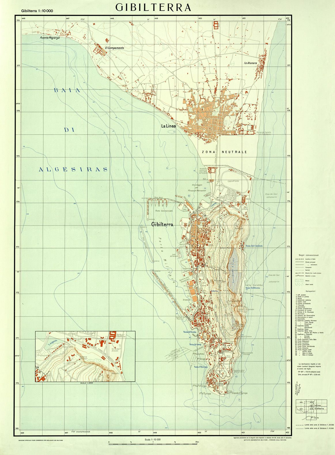"Carta rappresentante la piazzaforte di Gibilterra e la città di La Linea compilata dalla divisione cartografica dell' IGM nel 1941. Fonte di compilazione una carta Tedesca alla stessa scala aggiornata con fotogrammi forniti dall' aeronautica, in basso a sinistra è inserito un riquadro con la pianta della zona Strada Torre del Diavolo alla scala di 1:5.000"