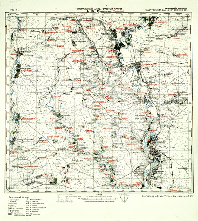 "Carta Tedesca riproduzione da analoga carta Russa con traduzione della toponomastica, esiste anche un montaggio dei fogli M - 37 -125 Artemowsk e M - 37 - 137 Gorlowka ( File SE007897 )"