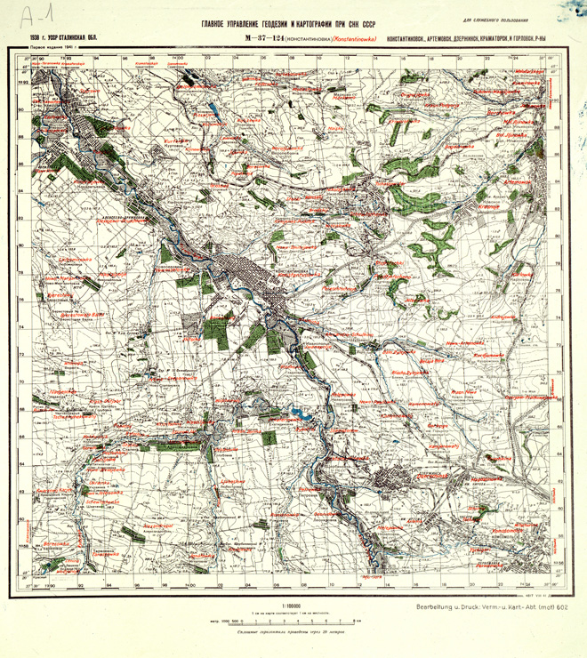 "Carta Tedesca riproduzione da analoga carta Russa con traduzione della toponomastica, esiste anche un montaggio dei fogli M - 37 -125 Artemowsk e M - 37 - 137 Gorlowka ( File SE007897 )"