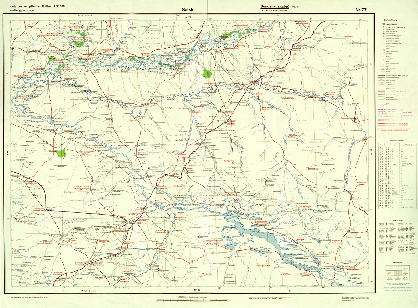 "Carta Tedesca derivata da ingrandimento della carta della Russia Europea alla scala di 1:420.000 del 1932, aggiornamenti per ferrovie, canali, bacini e impianti idrici furono ricavati dalla carta della Russia Europea alla scala di 1:500.000 del 1938 e dalla carta delle ferrovie e comunicazioni idriche della Russia Europea alla scala di 1:5.500.000 del 1940."