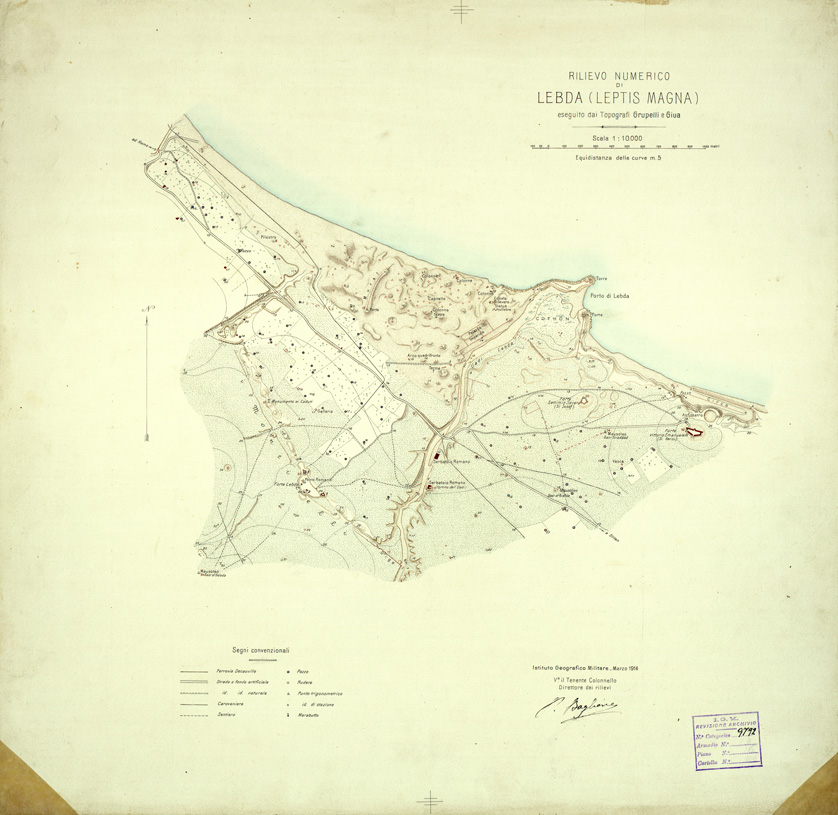 "Rilievo del territorio dell' antica Leptis Magna eseguito dall' IGM nel marzo 1914 su richiesta dell' Ufficio Archeologico di Tripoli."