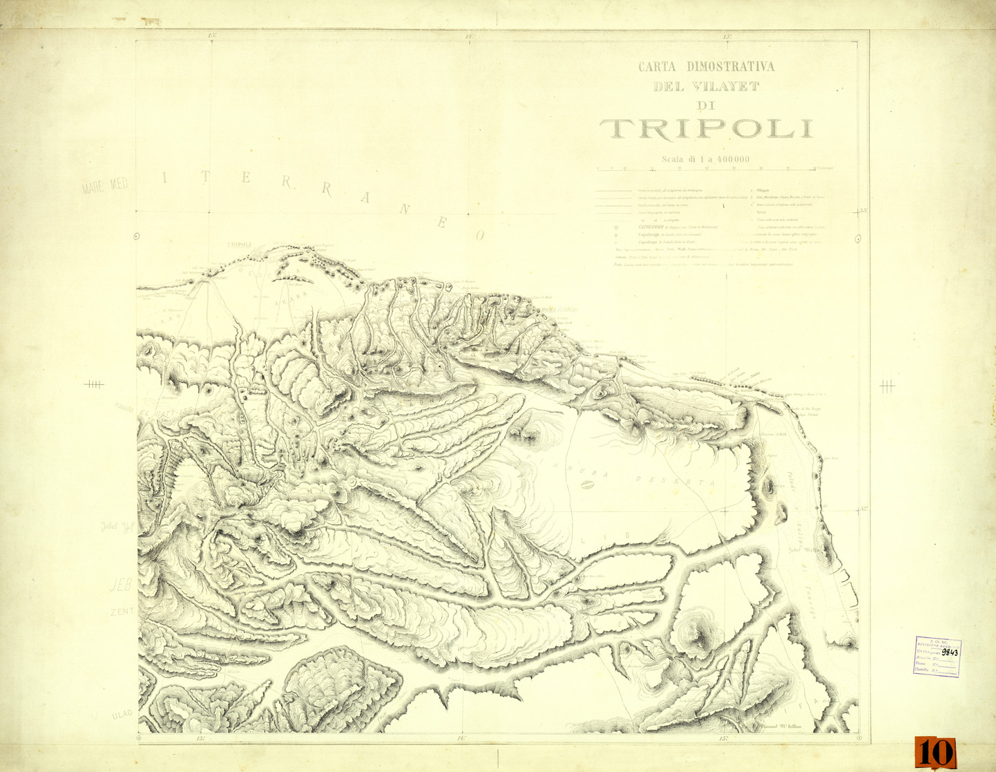 "Carta del territorio della Tripolitania fra la costa ed il Gebel e tra il confine Tunisino e Misurata, divisa in 2 fogli Est e Ovest, compilata e disegnata tra il 1887 e il 1888 è una delle carte generali allestite dall' IGM sui migliori documenti utilizzabili all' epoca degli avvenimenti che portarono alla guerra Libica, gli originali sono disegnati su cartone, 1 per la planimetria e toponomastica e 1 per l' orografia."