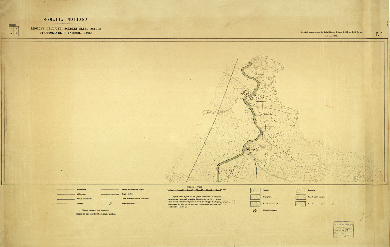 "La carta rappresenta il corso del Fiume Uebi Scebeli per un tratto di circa 14 km dal villaggio di Racheilo Omar Gudle a quello di Barre Hanadle e una striscia di territorio di circa 4 km sulla sponda sinistra, territorio degli Ualemoia Uacle, il rilievo fu eseguito dal topografo al seguito della missione di S.A.R. il Duca degli Abruzzi nel 1920. Gli originali in 2 fogli sono disegnati a penna su carta da disegno."