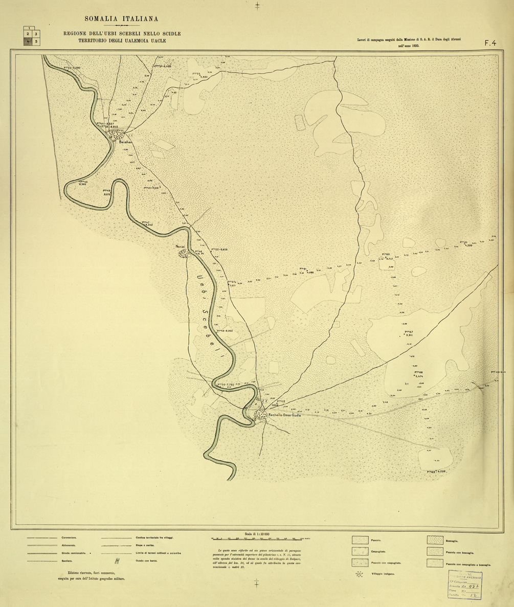 "La carta rappresenta il corso del Fiume Uebi Scebeli per un tratto di circa 14 km dal villaggio di Racheilo Omar Gudle a quello di Barre Hanadle e una striscia di territorio di circa 4 km sulla sponda sinistra, territorio degli Ualemoia Uacle, il rilievo fu eseguito dal topografo al seguito della missione di S.A.R. il Duca degli Abruzzi nel 1920. Gli originali in 2 fogli sono disegnati a penna su carta da disegno."