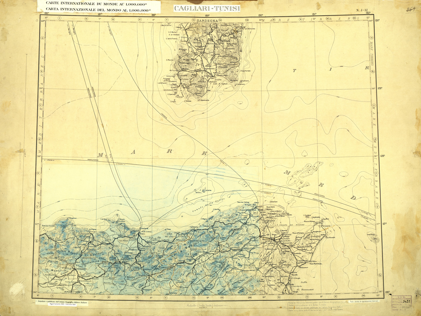 CARTA INTERNAZIONALE DEL MONDO FOGLIO J 32 CAGLIARI TUNISI ORIGINALE