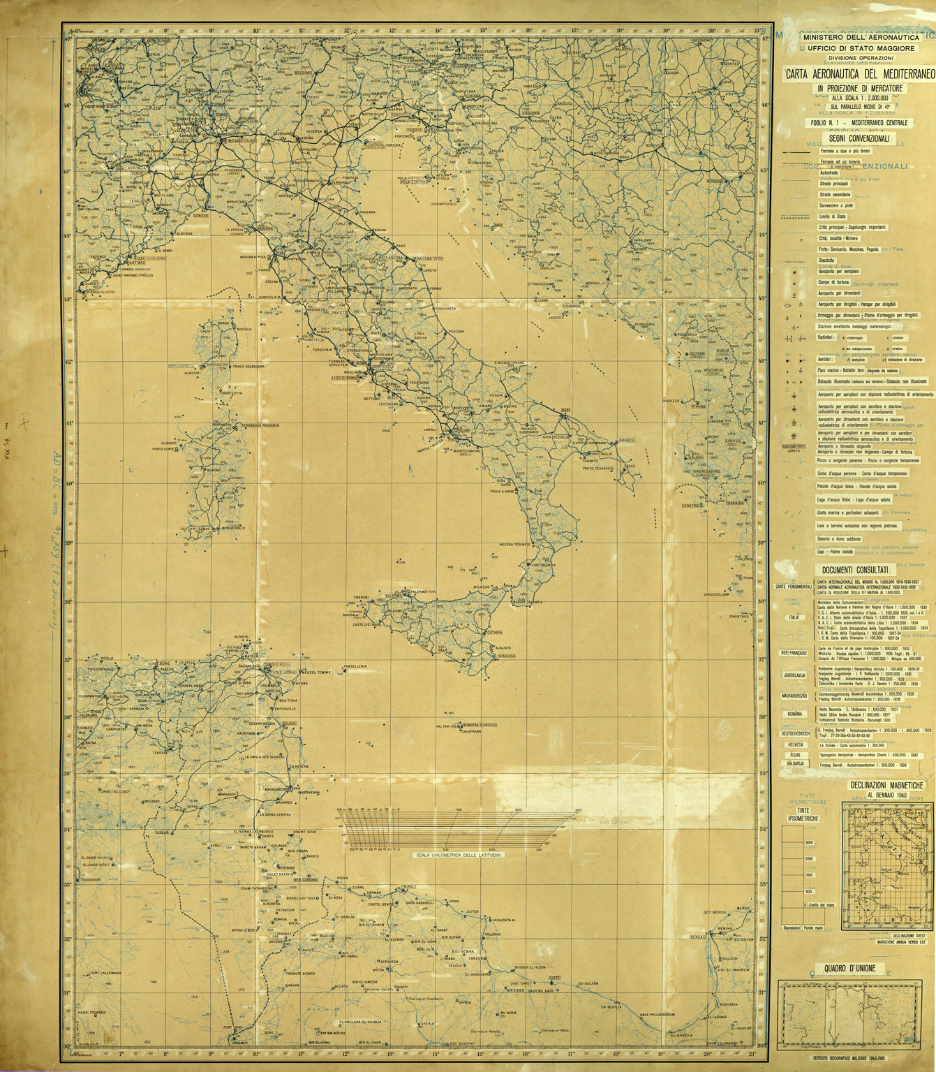 CARTA AERONAUTICA DEL MEDITERRANEO FOGLIO 1 MEDITERRANEO CENTRALE ORIGINALI A COLORI SEPARATI NERO