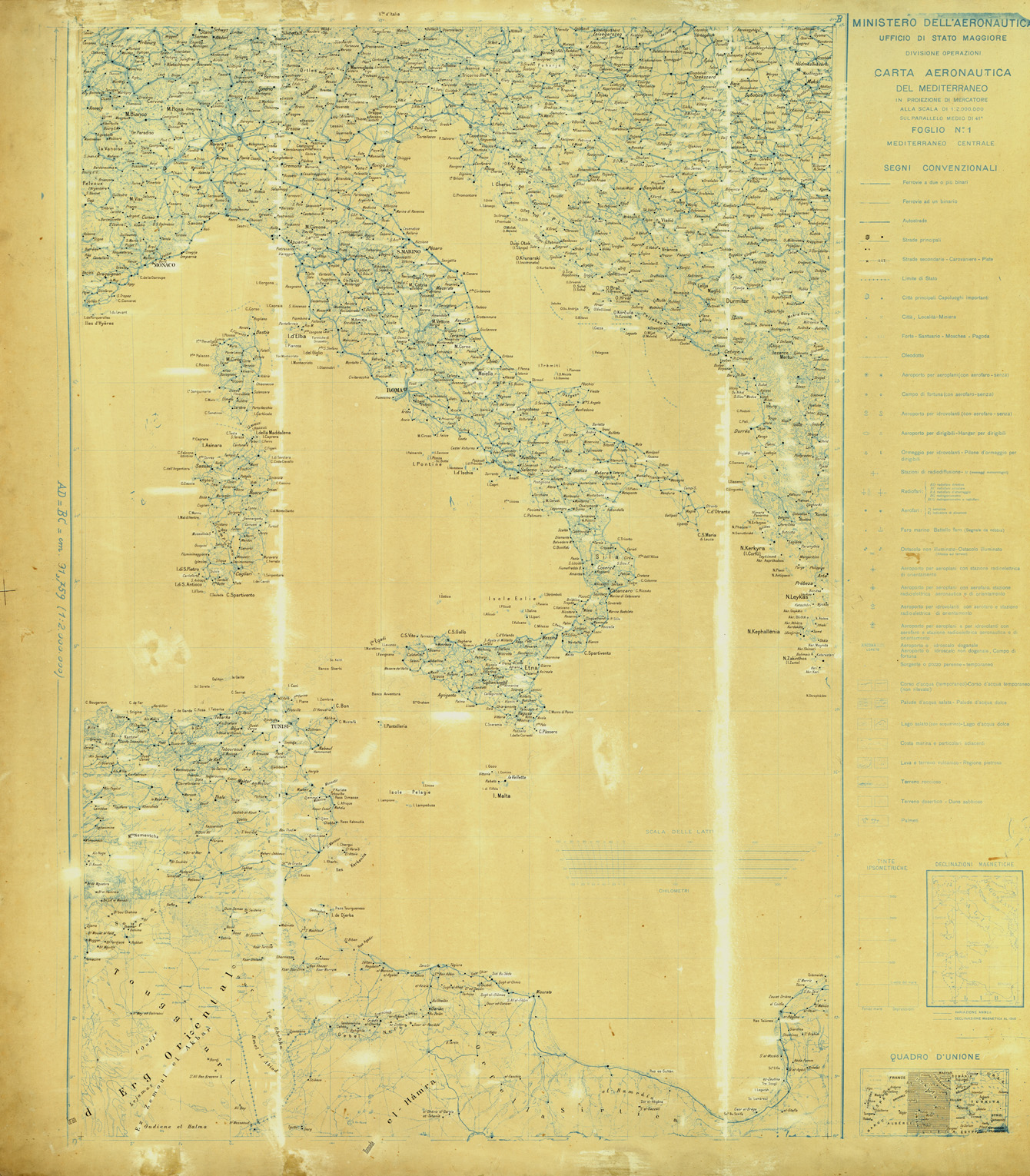 CARTA AERONAUTICA DEL MEDITERRANEO FOGLIO 1 MEDITERRANEO CENTRALE ORIGINALI A COLORI SEPARATI TOPONOMASTICA