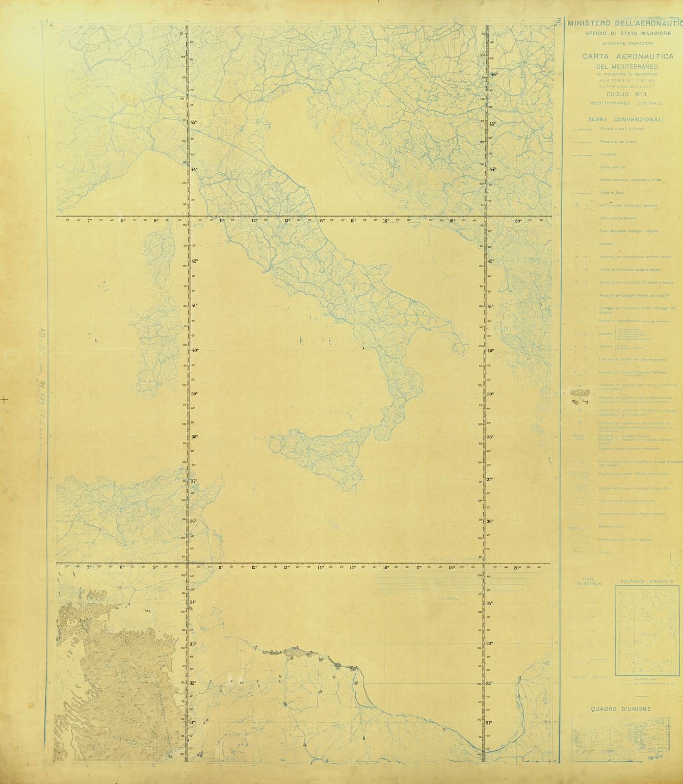 CARTA AERONAUTICA DEL MEDITERRANEO FOGLIO 1 MEDITERRANEO CENTRALE ORIGINALI A COLORI SEPARATI U.T.M.