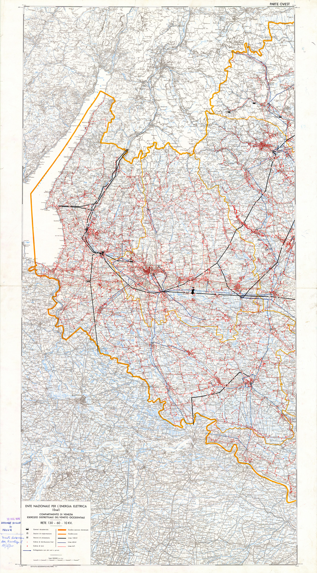 "Carta realizzata dalla Sezione Carte Speciali della Divisione Cartografica dell' IGM su richiesta dell' Ente Nazionale per l' Energia Elettrica. La carta è stata ottenuta mediante mosaicatura dei fogli della Carta d' Italia alla scala di 1:100.000 della zona interessata e di quest' ultima conserva le caratteristiche tranne che per la mancanza delle curve di livello per specifica richiesta dell' ente richiedente."
