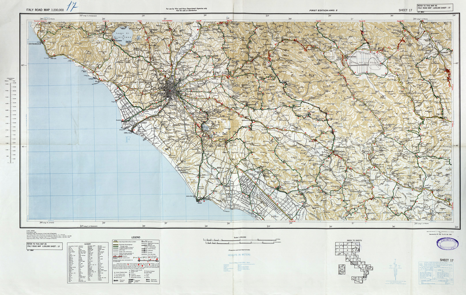 "Carta edita dall' Army Map Service Statunitense sulla base della Carta d' Italia al 200.000 del Touring Club Italiano."