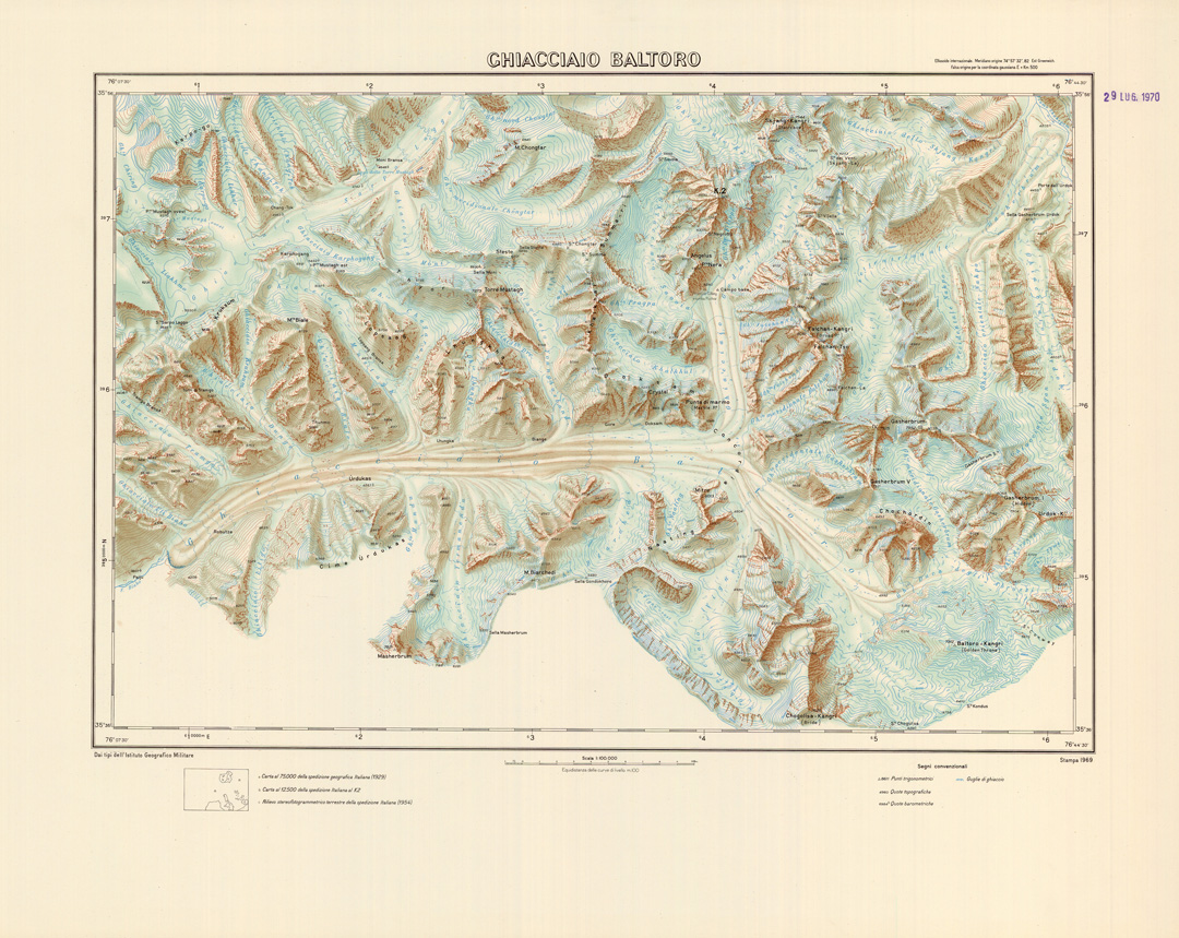 "Carta realizzata dalla sezione carte speciali della divisione cartografica dell' IGM dai rilievi eseguiti nel corso della spedizione scientifico - alpinistica Italiana al Karakorum 1953 - 1955"