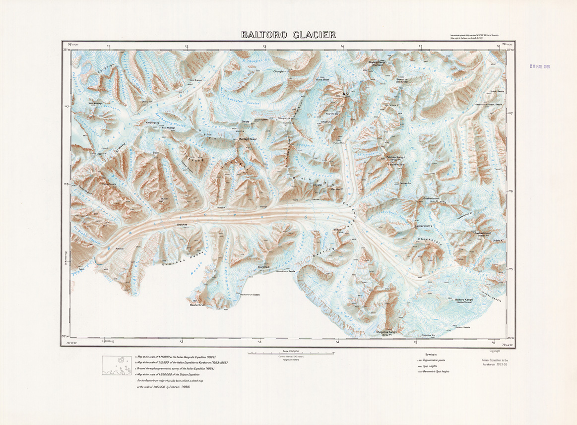 "Edizione Inglese della carta realizzata dalla sezione carte speciali della divisione cartografica dell' IGM dai rilievi eseguiti nel corso della spedizione scientifico - alpinistica Italiana al Karakorum 1953 - 1955"