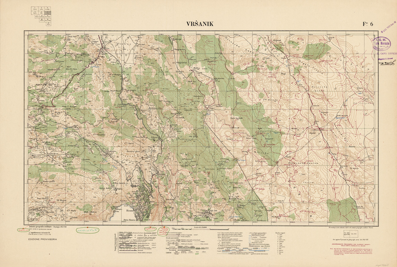 "Carta realizzata dalla Commissione Regionale "Montenegro" al tempo della delimitazione di frontiera ( 1941 - 1942 ) ottenuta ridisegnando in veste Italiana l' analoga carta dell' Istituto Geografico Militare Austriaco nelle edizioni dal 1903 al 1915 aggiornata con fotografie aeree ed elementi dedotti dalla carta Yugoslava alla scala di 1:100.000"