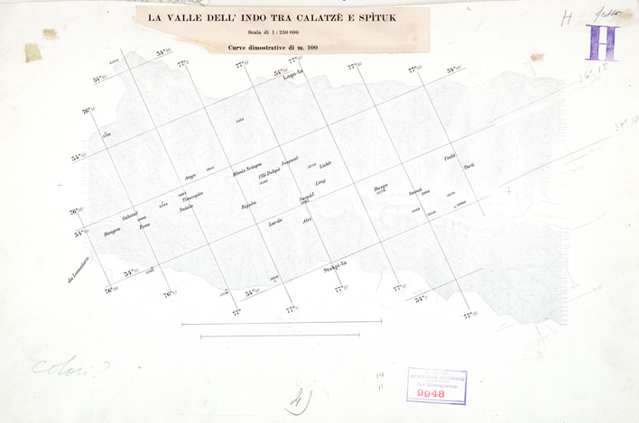 "Originale disegnato a penna alla scala di 1:200.000 della toponomastica della carta della valle dell' Indo tra Kalatze e Spituk alla scala di 1:250.000 La spedizione organizzata e diretta dal Dr. F. de filippi è descritta in una collana composta da diversi volumi tematici corredati da fotografie e cartografia ( Biblioteca IGM Inventario 6806 - 6807 ) nel 1934 è stato pubblicato un ulteriore volume anche esso corredato da fotografie e cartografia che racconta in maniera più sintetica la spedizione ( Biblioteca IGM Inventario 8093 )"