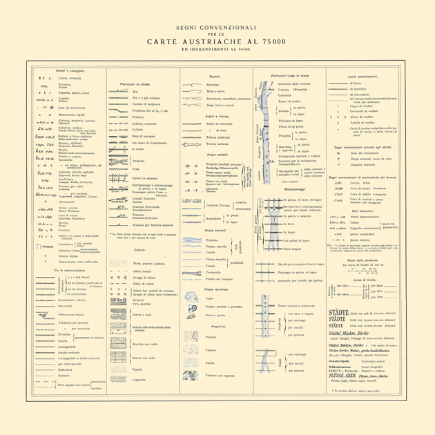 "Dotazioni cartografiche di mobilitazione, tale tabella,dei segni convenzionali per le carte Austriache in scala 1:75.000 ed ingrandimenti 1:50.000, è presente nel retro di ogni foglio."