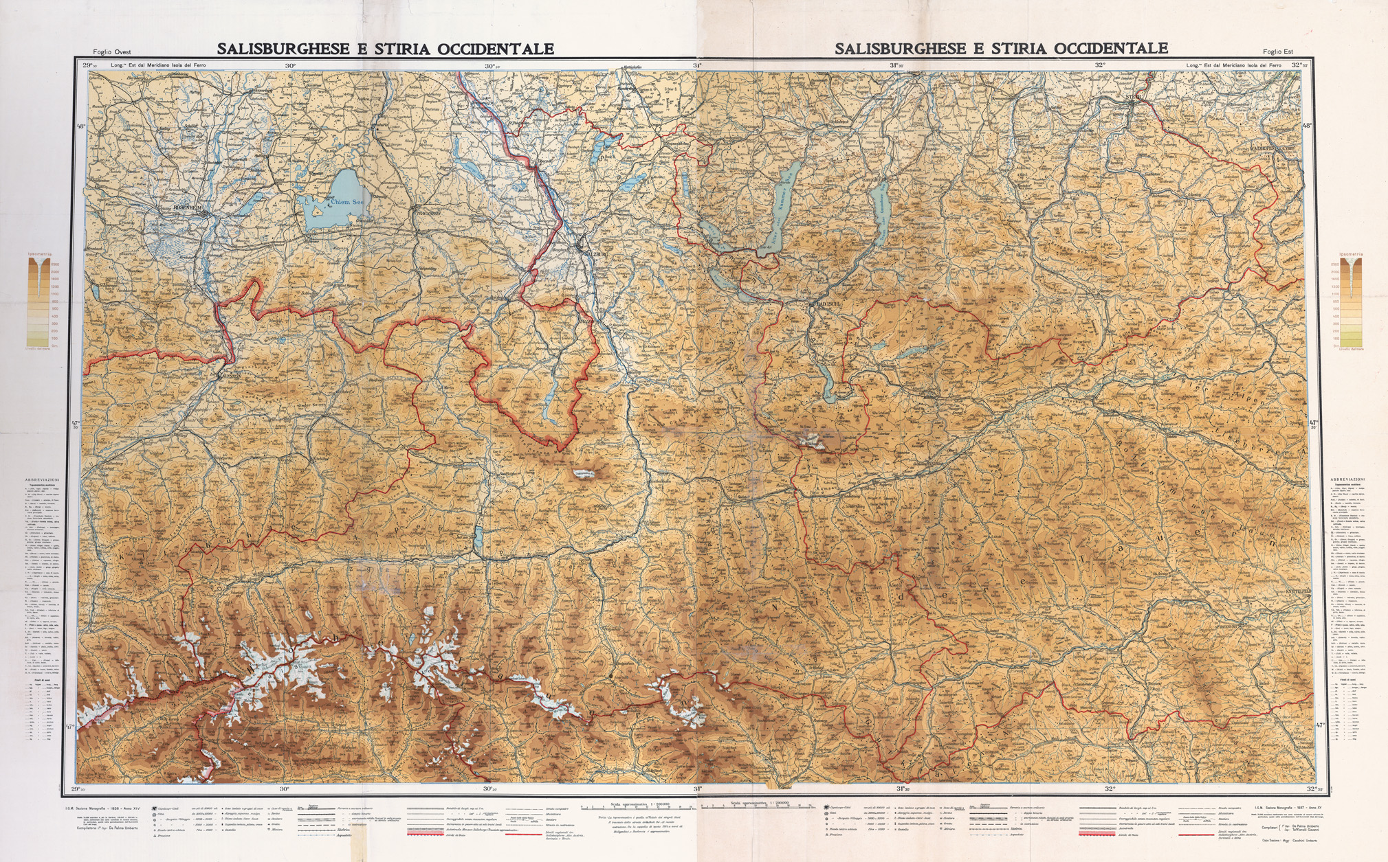 "Carta dimostrativa dei territori limitrofi alla frontiera nord - orientale realizzata dall' Ufficio Monografie dell' IGM Montaggio dei due fogli che compongono la carta ( Ovest - Est file SE003519 SE003520 )"