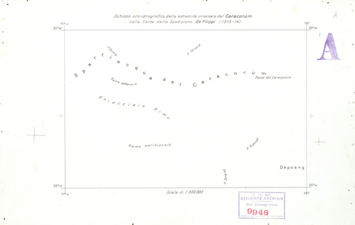 "Originale disegnato a penna della toponomastica dell' estremità orientale del Karacorum dalla carta della spedizione De Filippi del 1913 - 1914 La spedizione organizzata e diretta dal Dr. F. de filippi è descritta in una collana composta da diversi volumi tematici corredati da fotografie e cartografia ( Biblioteca IGM Inventario 6806 - 6807 ) nel 1934 è stato pubblicato un ulteriore volume anche esso corredato da fotografie e cartografia che racconta in maniera più sintetica la spedizione ( Biblioteca IGM Inventario 8093 )"