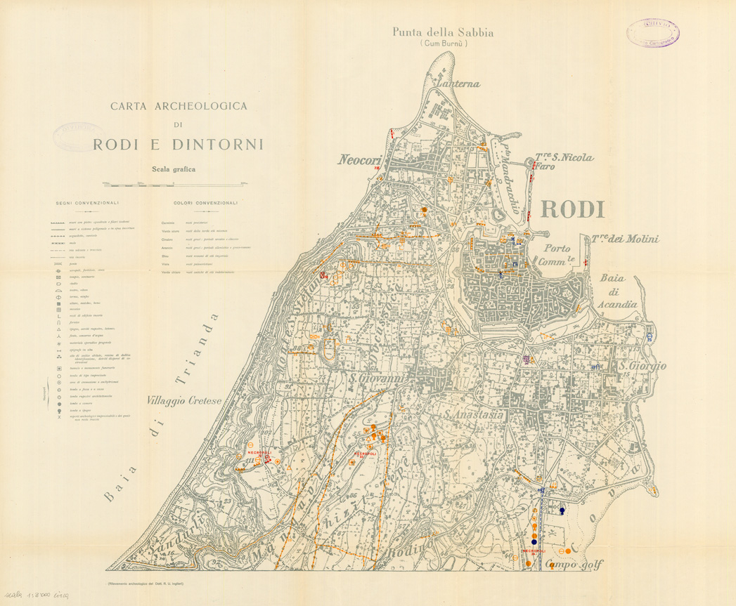 "Carta annessa ad un libretto esplicativo, ( vedi anche files SE008797 e SE008798 ) edita a cura del FERT (Istituto Storico Archeologico), che nel 1929 affido' al dott. Raffaele Umberto Inglieri il compito di ricognire e censire i reperti archeologici da tutelare nell'isola di Rodi."